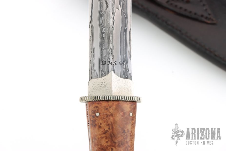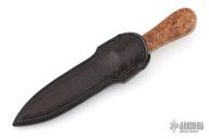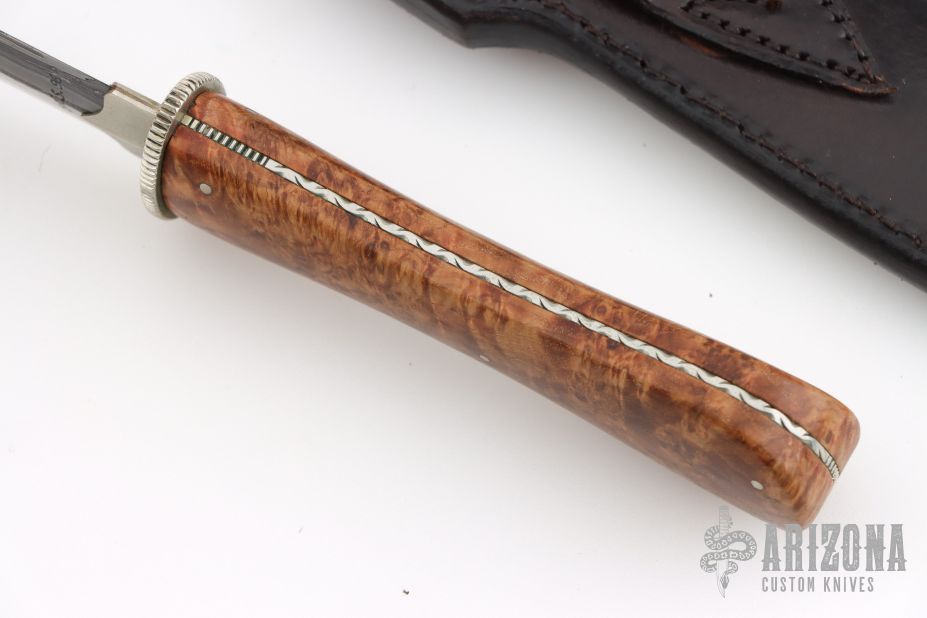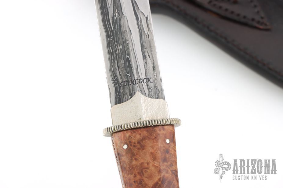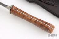 This Dagger by Master Smith Tim Hancock features a double edge Damascus blade with .180" blade stock and .961" blade depth, hidden/frame tang construction. The handle has a hammered nickel silver habiki and coin edged guard, burl wood scales with nickel silver pins, fileworked nickel silver frame. Comes with a black leather sheath with exotic hide overlay. Comes with a zippered case. Excellent condition. Dated 1996