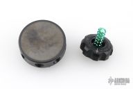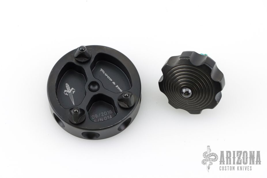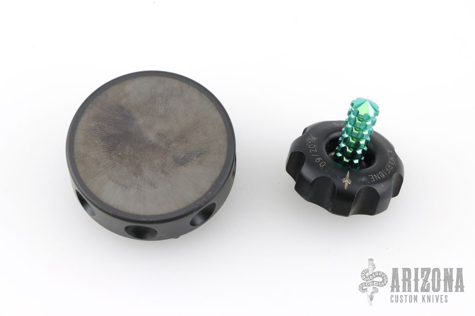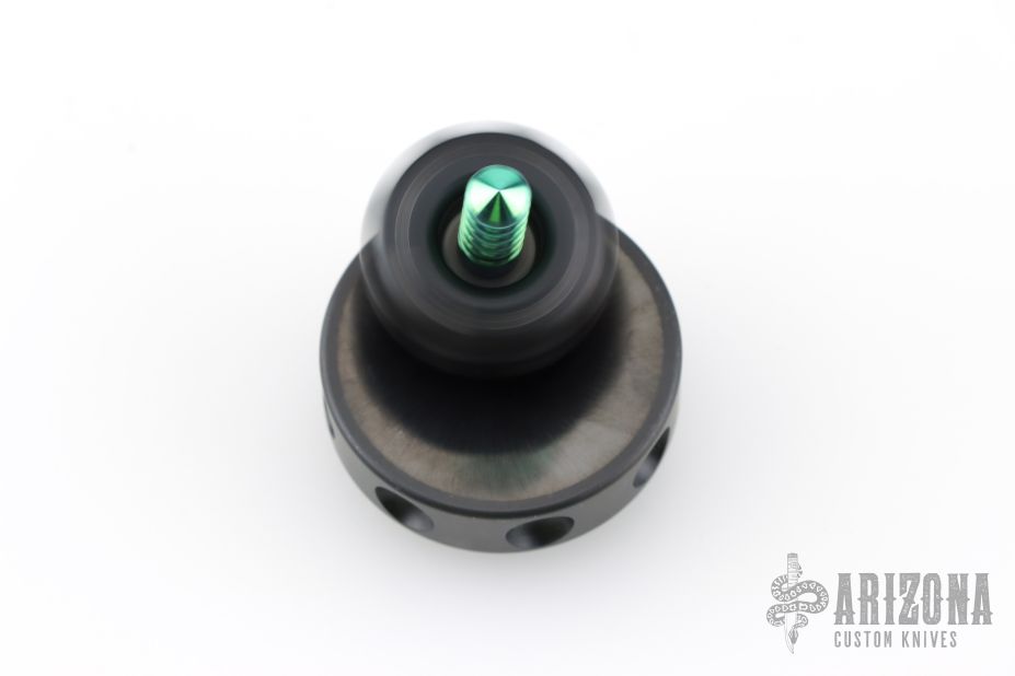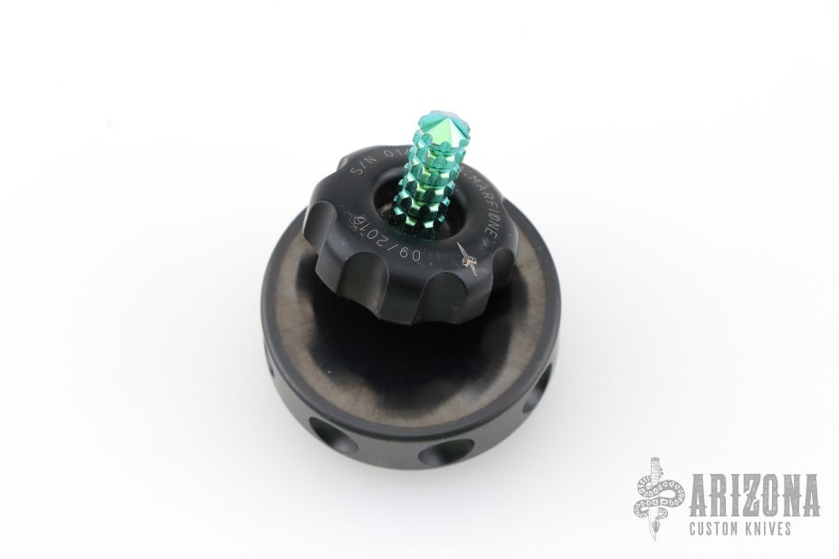 Spin Top - Hefted Aluminum & Green Titanium Plus Base Plate Set by Marfione Custom. Dated 09/2016 S/N 014. The stand weighs 3.4oz, is 1.75" in diameter, and .75" tall. Has scuffs and scratches, good condition otherwise.