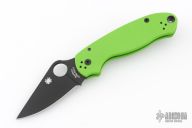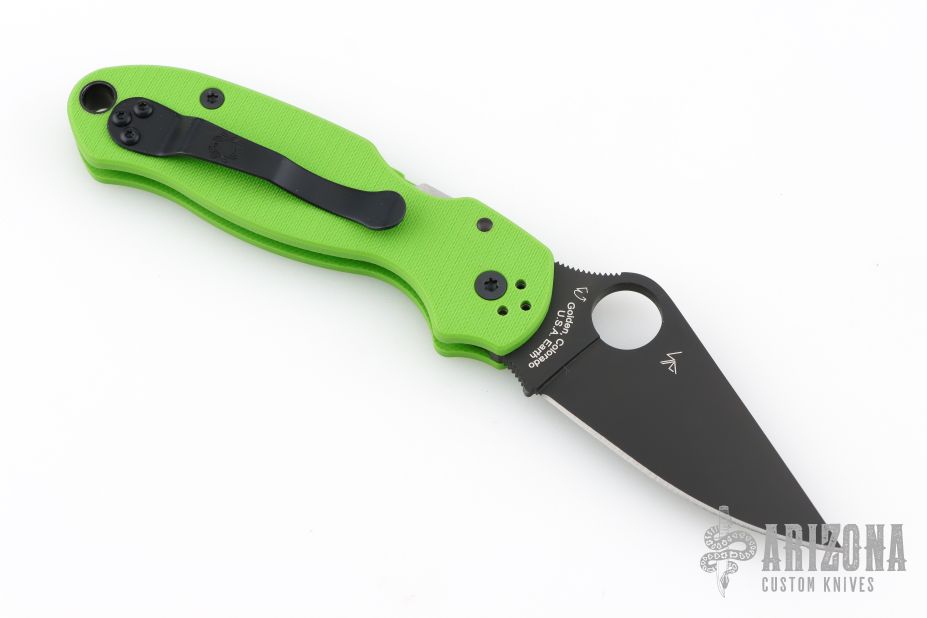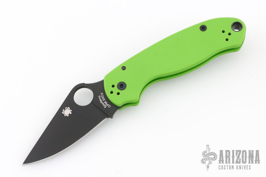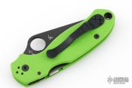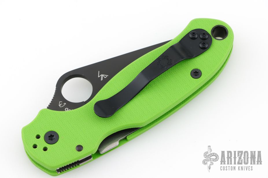 This Para 3 by Spyderco features a black finished clip point blade with thumb hole and notched thumbrest. The handle features neon green G-10 scales over nested steel liner and stand-offs. The steel pocket clip is 4 way adjustable. Includes original box, paperwork. New condition.