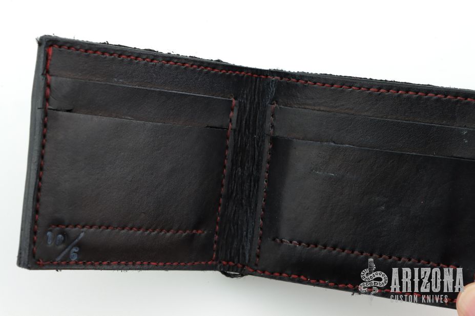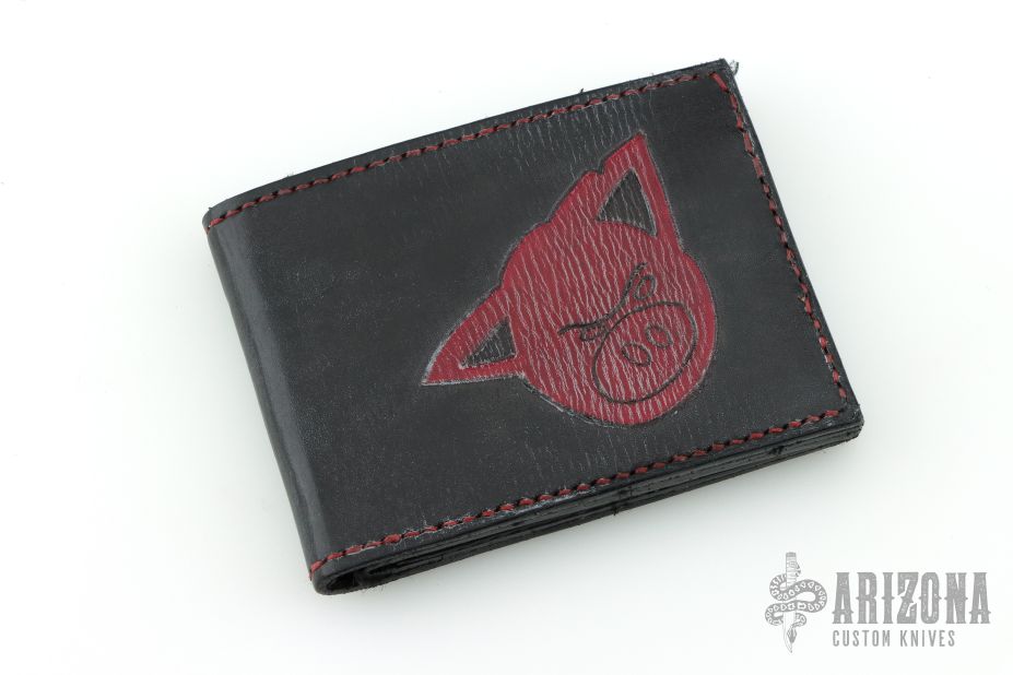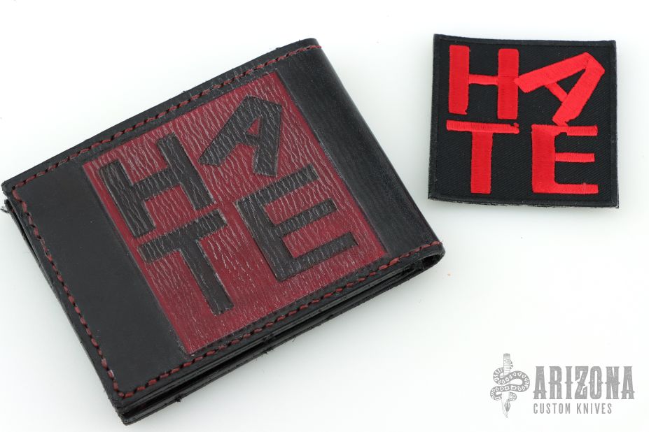 This Bi-fold Wallet by 10/6 Leather has been made for the Hate Project. It is hand tooled black and red leather. Has 4 card slots and a money slot. Included is a $2 bill with the Hate Project pig stamp. Excellent condition. Comes with a HATE patch as well.