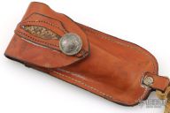 This Lockback from Bull Dog Brand Knives features a polished blade with nail nick and etching. The handle has nickel silver bolsters, stag covers over brass liners and steel backspring. Has a few light scratches and patina, otherwise excellent condition. Comes with a leather belt sheath.