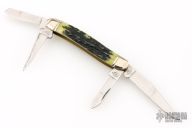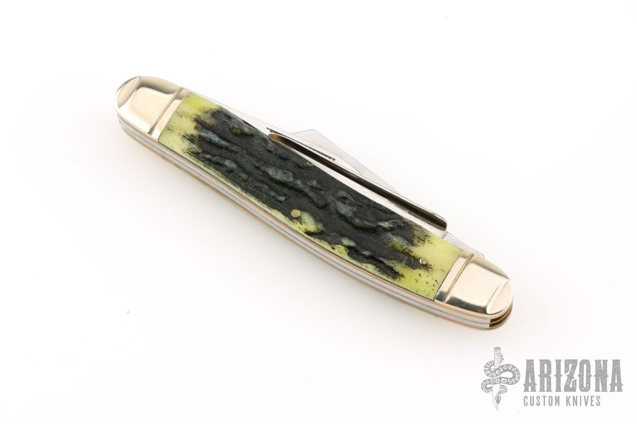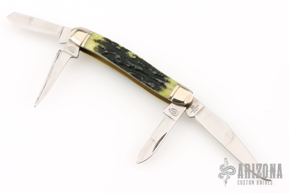 This stockman slipjoint was made to celebrate the 175th Anniversary of Colt. It has polished blades with nail nicks, nickel silver bolsters, stag covers, brass pins and liners, stainless steel springs. Comes with original box. Excellent condition.