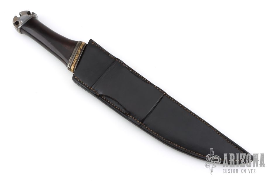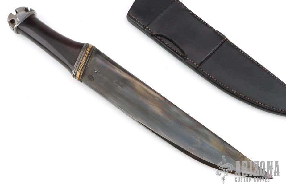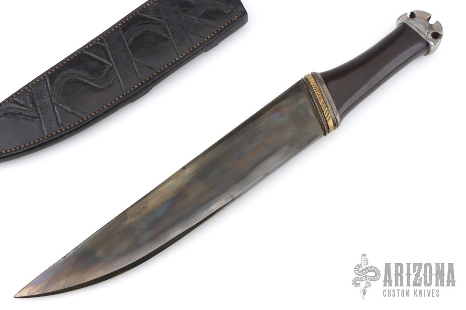 This Large Ceremonial Seax by Donald E Weiler feautres a polished and blued Seax style blade with .283" blade stock and 2.150" blade depth, hidden tang construction. The handle has fluted blued steel guard with a fileworked brass spacer, ironwood grip, blued steel decorative butt. Comes with a handle tooled black leather sheath and a zippered case. Has a few light scratches, otherwise excellent condition.