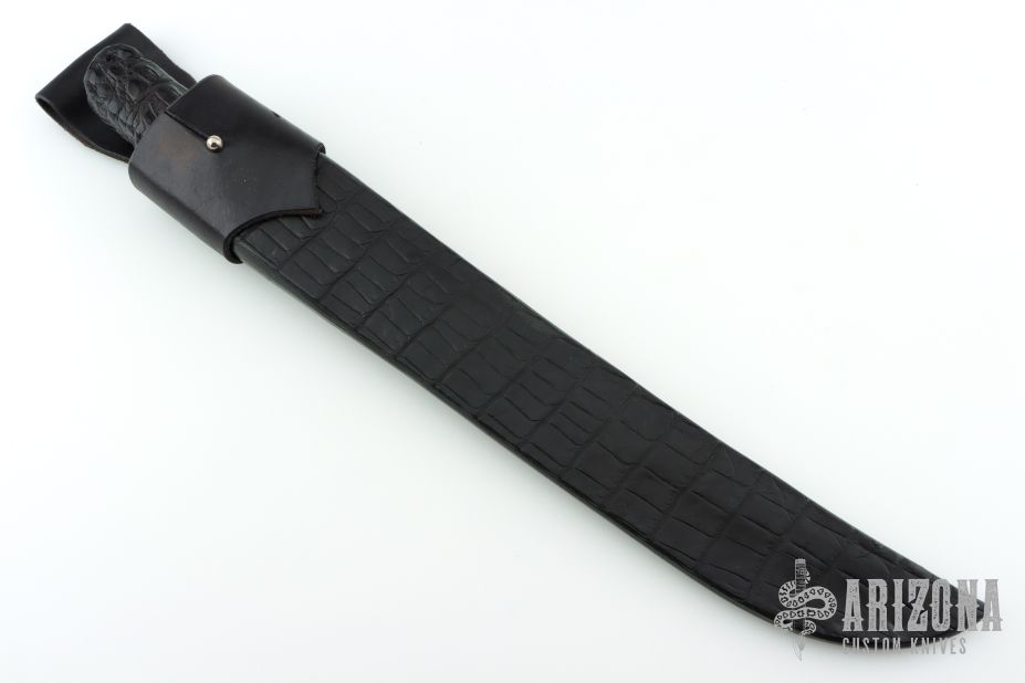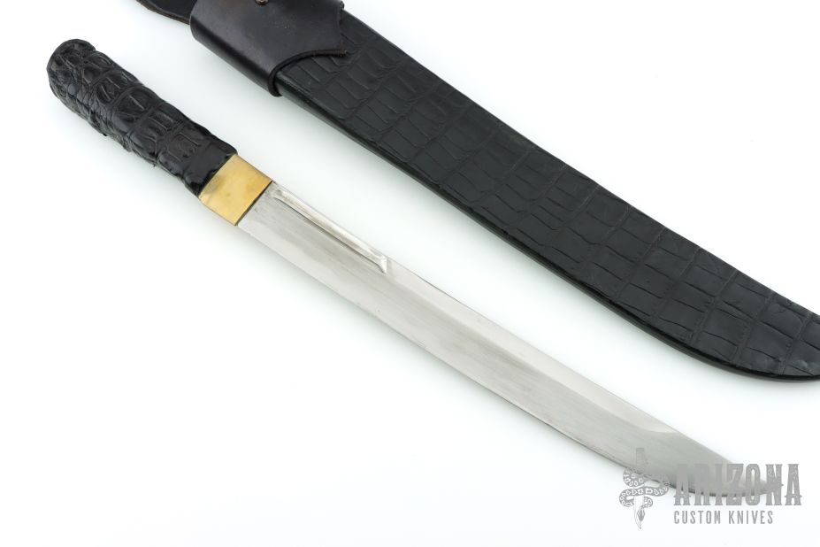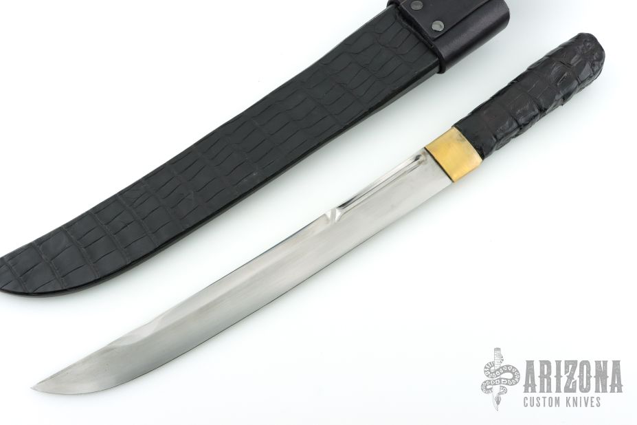 This Wakizashi by Jim Ort features a hand rub satin finished blade with fullers and visible hamon, .295" blade stock and 1.345" blade depth, hidden tang construction. The handle has a brass habiki and a crocodile hide covered grip. Comes with a black leather sheath with crocodile skin overlay. Has scratches and patina, otherwise good condition.