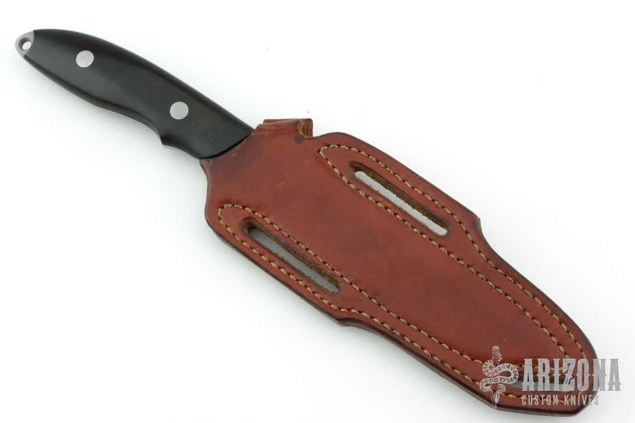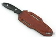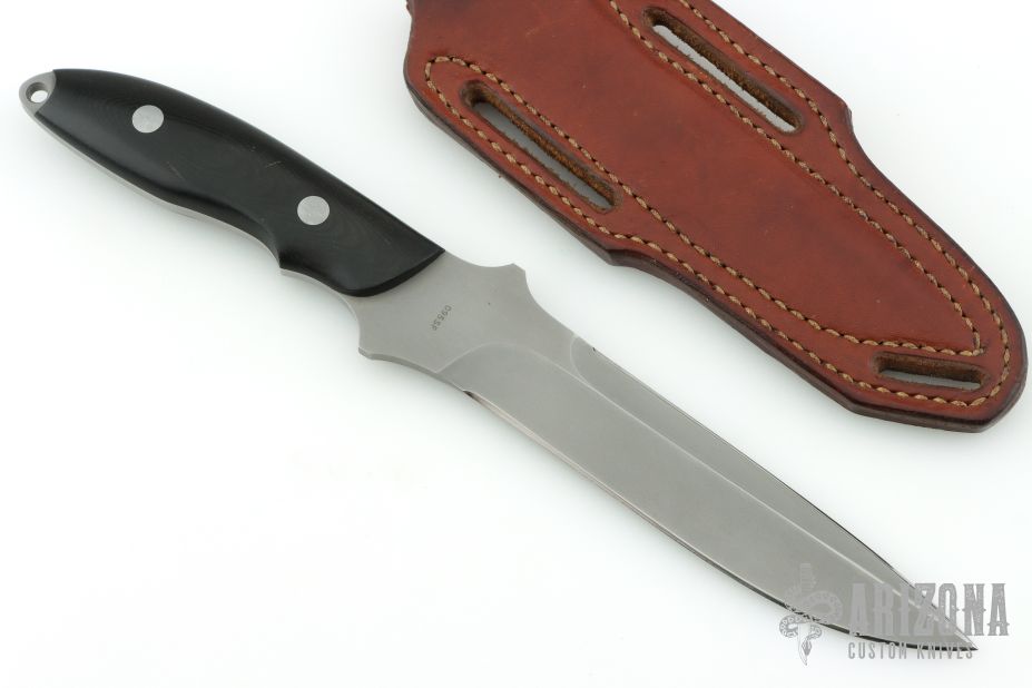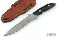 This knife by Vaughn Neeley of Timberline Knives features a bead blasted drop point blade witha  sharpened top edge, .183" blade stock and 1.131" blade depth, full tang construction. The handle has black linen micarta scales. Comes with a brown leather sheath. "095SF". Has light scuffs and scratches, otherwise excellent condition.