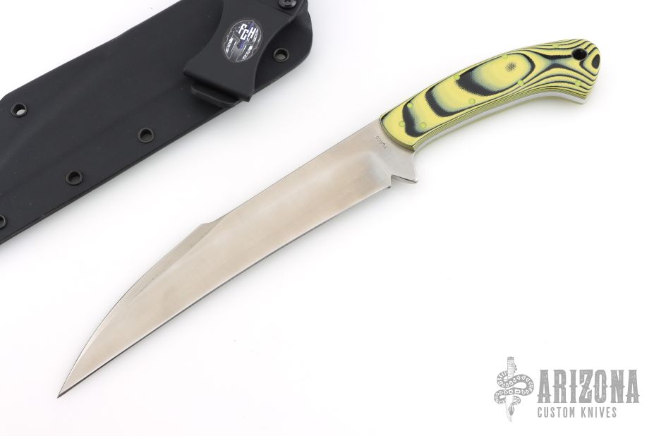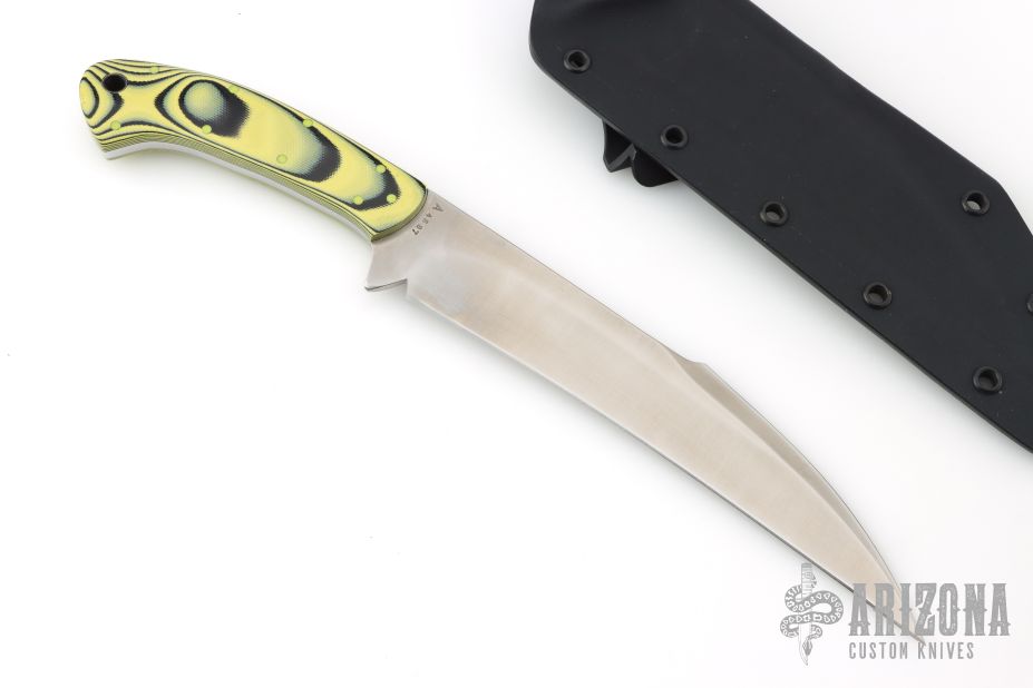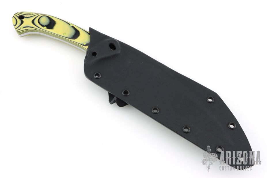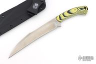 The Punisher Guinuting Philipino Marine Sword by Micky Yurco, features a wharncliffe/hawkbill style blade with a sharpened top edge, full tang construction, .174" Blade Stock 1.435" Blade Depth. The handle has yellow/black G10 scales with yellow G-10 pins and a lanyard hole. Comes with a kydex sheath with belt clip. Has some light scratches, otherwise excellent condition.