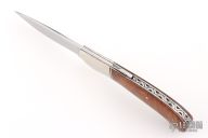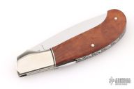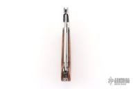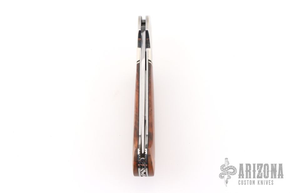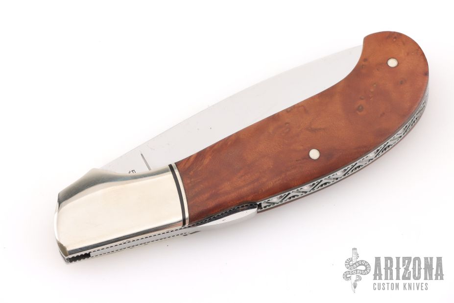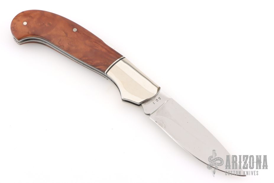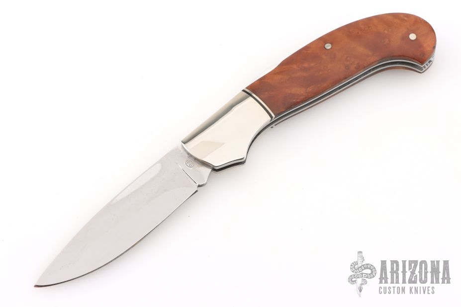 This lockback by Bob Jones features a mirror polished blade with a full face hollow grind and visible temper line. The handle features dovetailed nickel silver bolsters, burl wood covers with black liners, black and nickel silver spacers, fileworked stainless steel liners and backspacer. Comes in a leather pouch. Has some light scratches and patina, good condition otherwise. #501