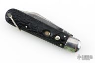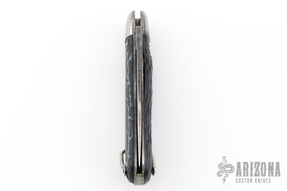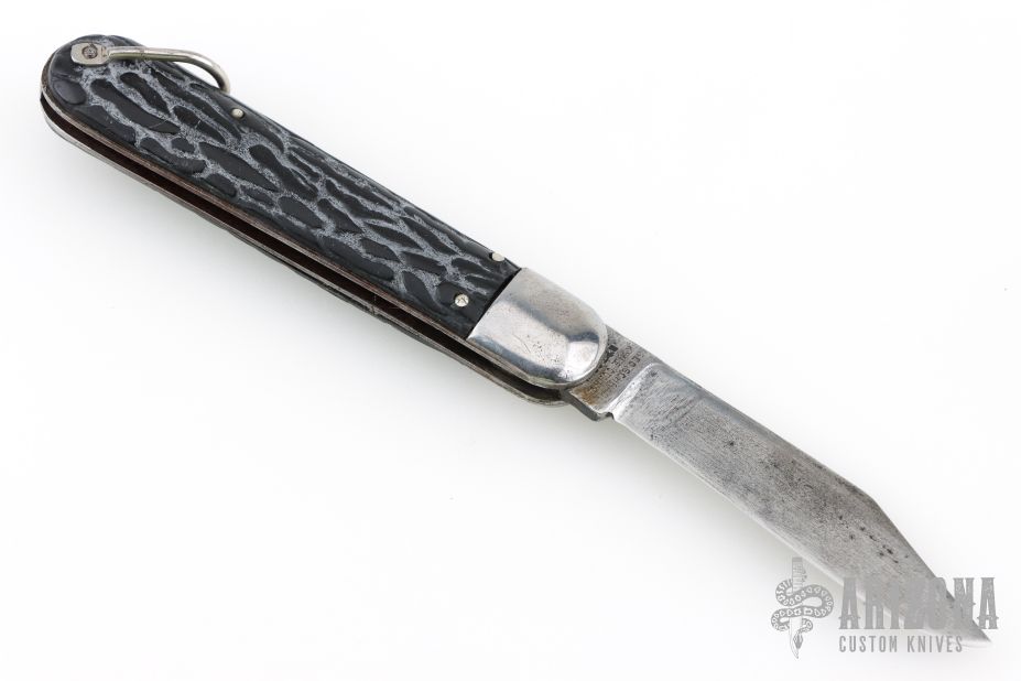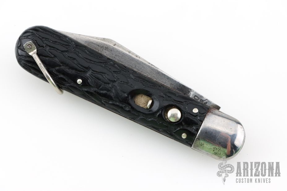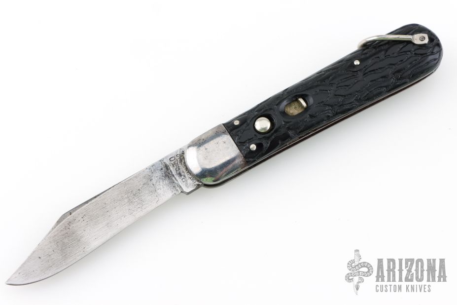 This antique auto by Presto features a clip point blade. The handle has steel bolsters, jigged black scales, steel liners and backspacer, has safety. Nice action and blade seating. Has some blade play, scratches and oxidation, otherwise good condition.