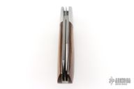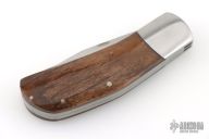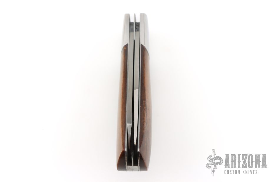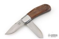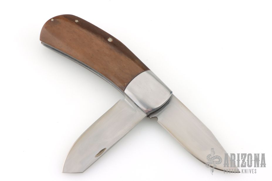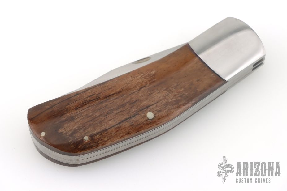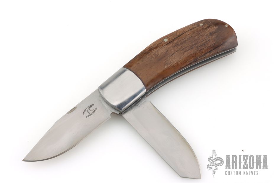 This knife by Jeff Cover features two hand rub satin finished blades with nail nicks.  The handle features dovetail stainless steel bolsters, giraffe bone covers with black liners, stainless steel liners and springs. Has half-stops.  Has some scratches, otherwise good condition. Comes with a zippered case.