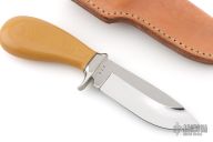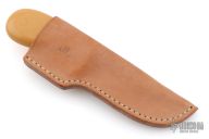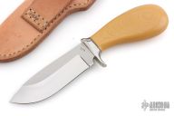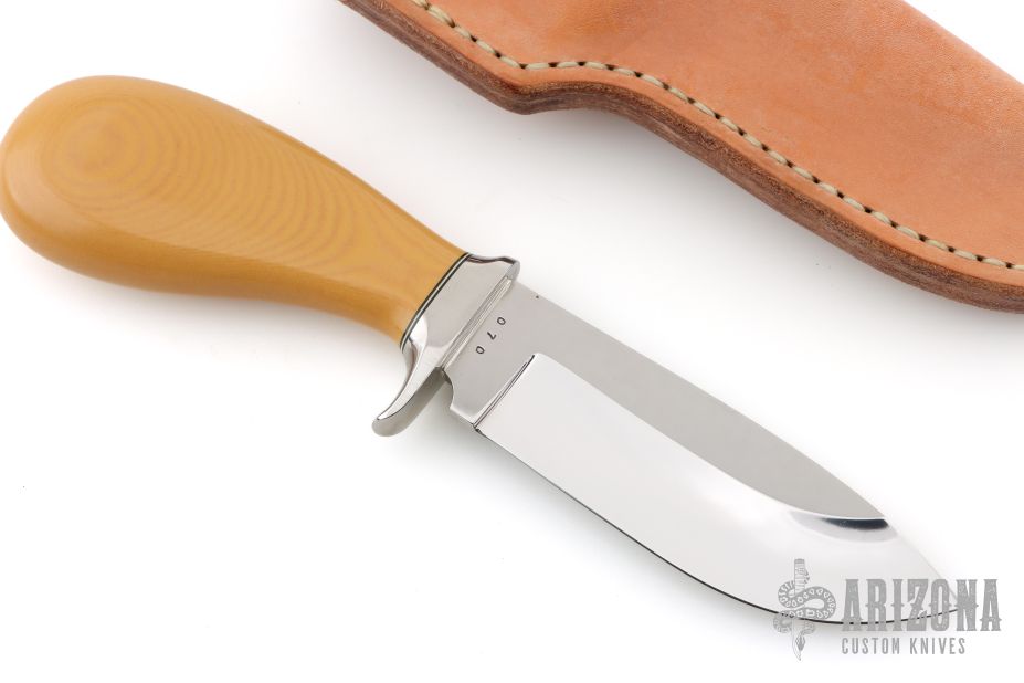 This knife by Ray Beers features a mirror polished drop point blade with .177" blade stock and 1.450" blade depth, hidden tang construction.  The handle has a nickel silver guard with a yellow paper micarta grip. Includes a brown leather sheath.  Excellent Condition.