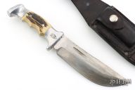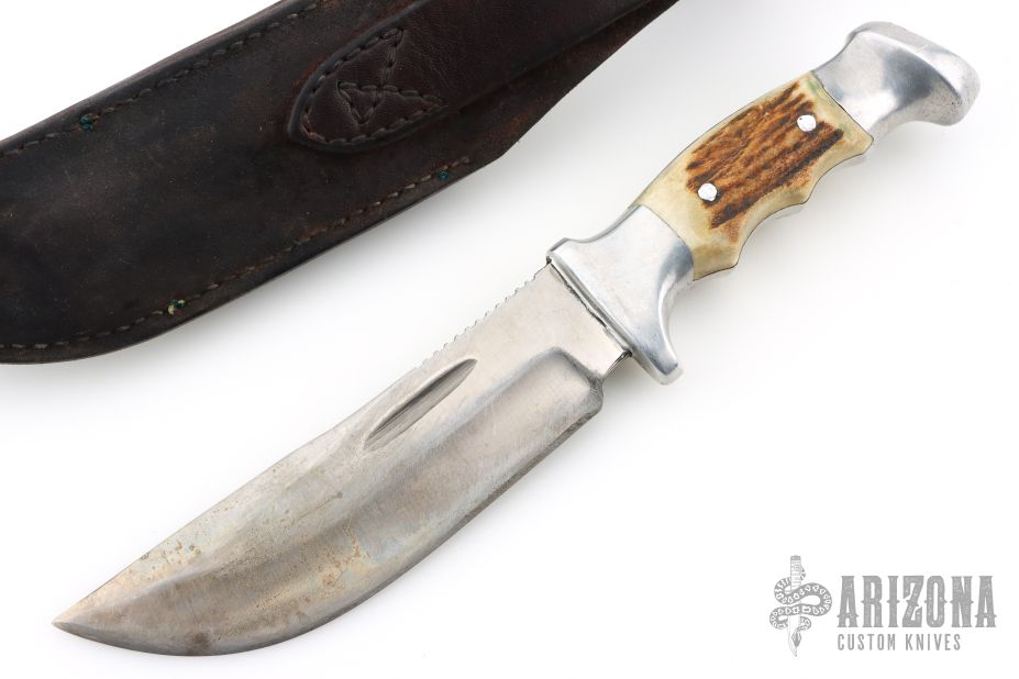 This Model 20A Skinner by Rudy Ruana features a satin finished blade with false top edge, fullers and notched thumbrest, .187" blade stock and 1.630" blade depth, hidden tang construction. The handle is cast from aluminum with elk inserts. M Stamp on the guard. Comes with a black leather sheath. Has scratches, patina, has been resharpened, otherwise fair condition.
