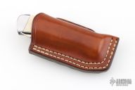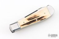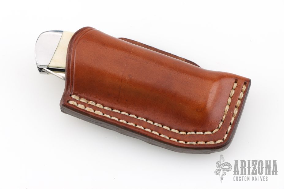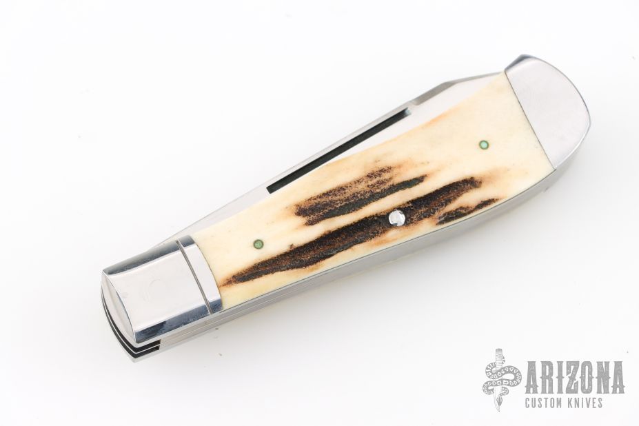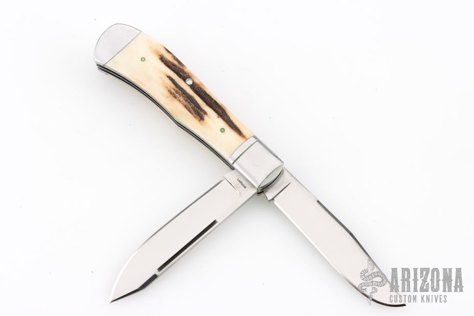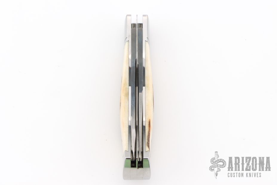 This slipjoint by Jerry Langbein features mirror polished blades with nail nicks. The handle has stainless steel fluted and dovetailed bolsters with integral liners, stag inlays, dovetailed stainless steel rear bolsters, stainless steel liners and springs. Has a couple light scratches, otherwise excellent condition. Comes with a brown leather sheath.