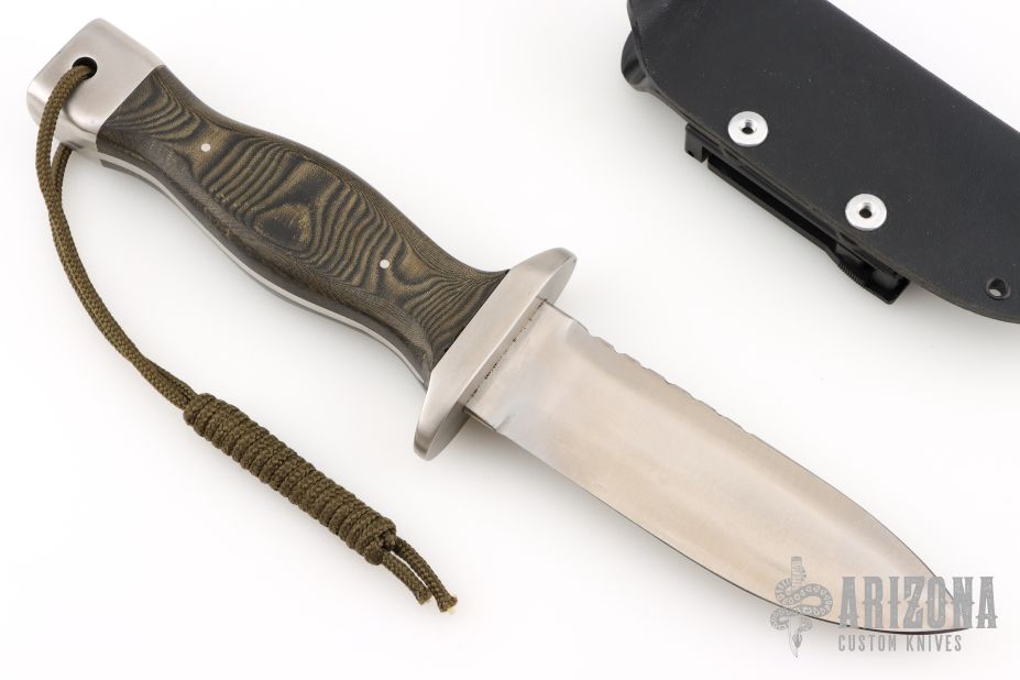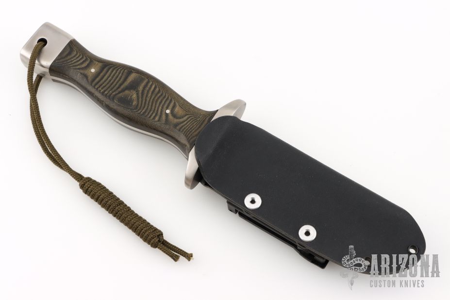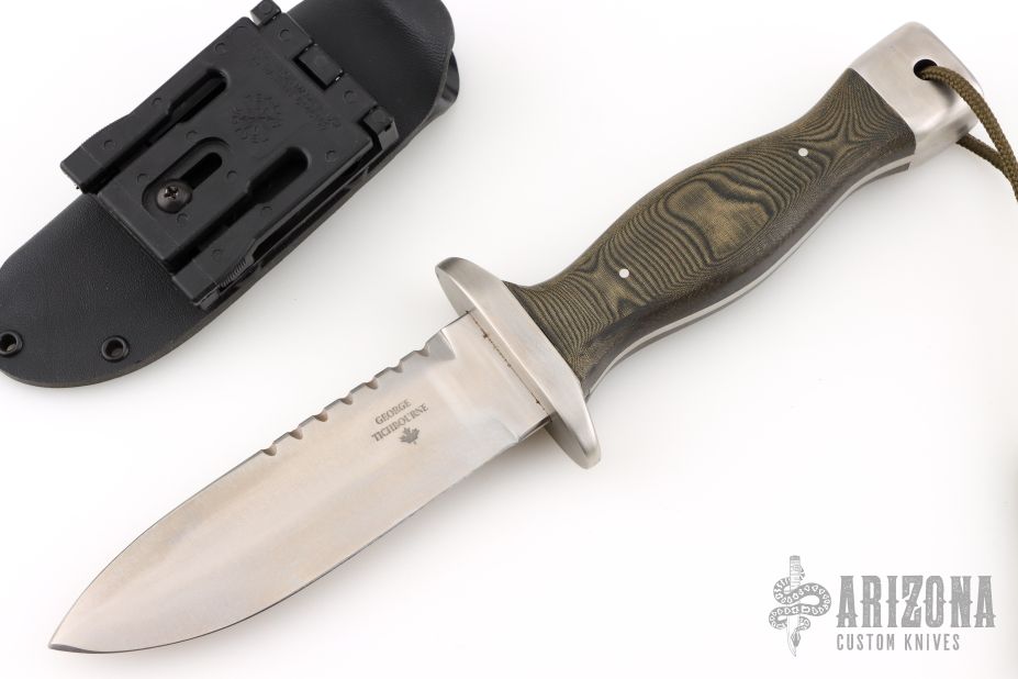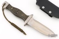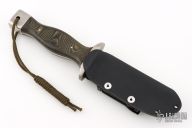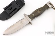 This Fighter by George Tichbourne features a satin finished double edged blade with serrations on the top edge, .127" blade stock and 1.472" blade depth, full tang construction. The handle has stainless steel guard and rear bolsters, black linen micarta scales. Comes with a kydex sheath with TekLok. Has some light sheath scratches, otherwise excellent condition.