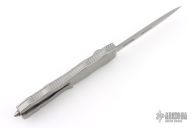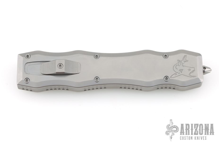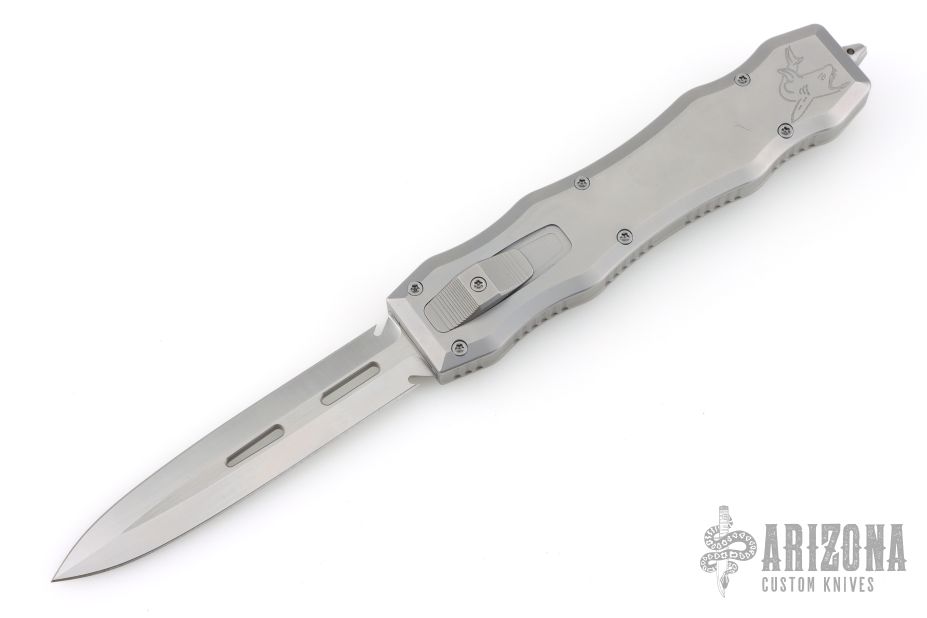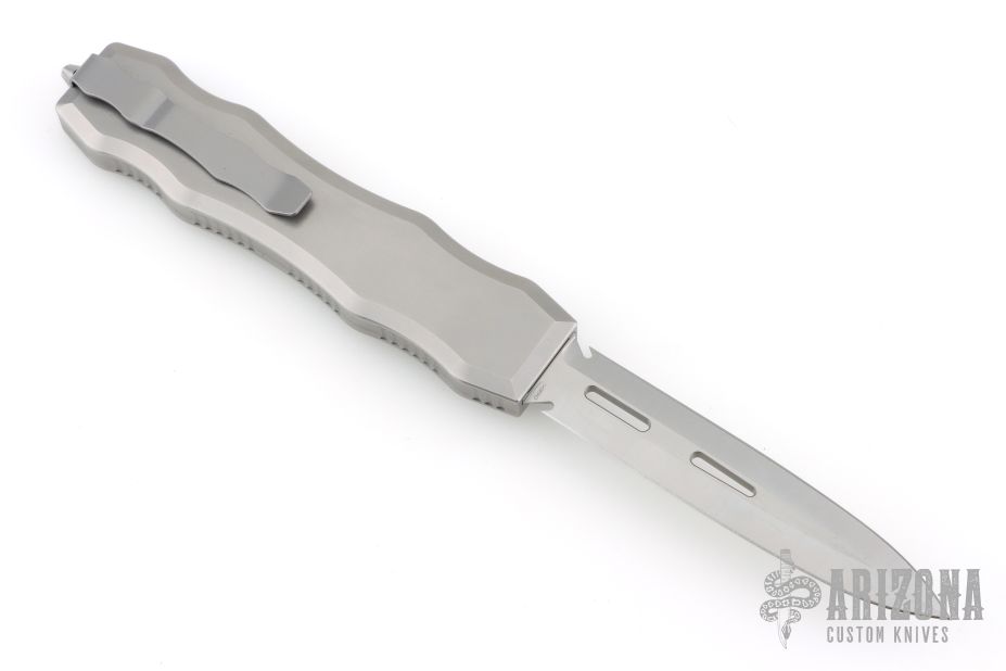 This Brand New Sand Shark OTF double action automatic by Desert Knife Works features a satin finished double edge blade and a bead blasted stainless steel handle with matching tip down clip. New condition. Comes with original box.