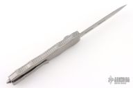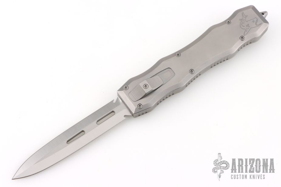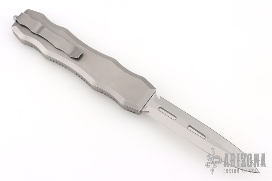 This Brand New Sand Shark OTF double action automatic by Desert Knife Works features a satin finished double edge blade and a bead blasted stainless steel handle with matching tip down clip. New condition. Comes with original box.