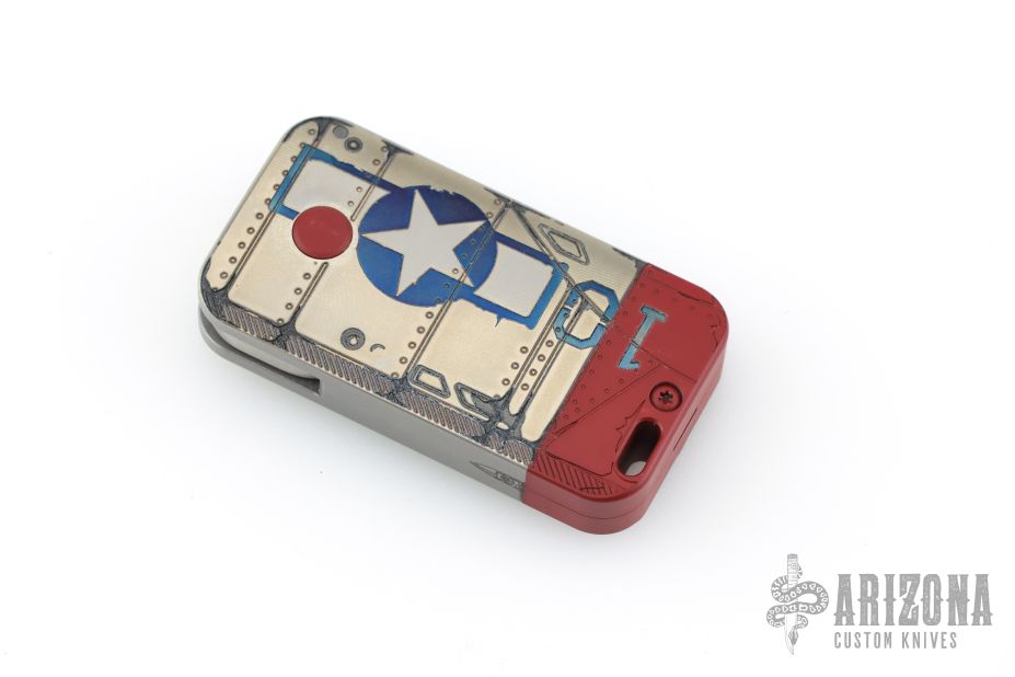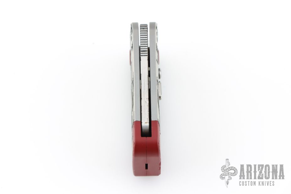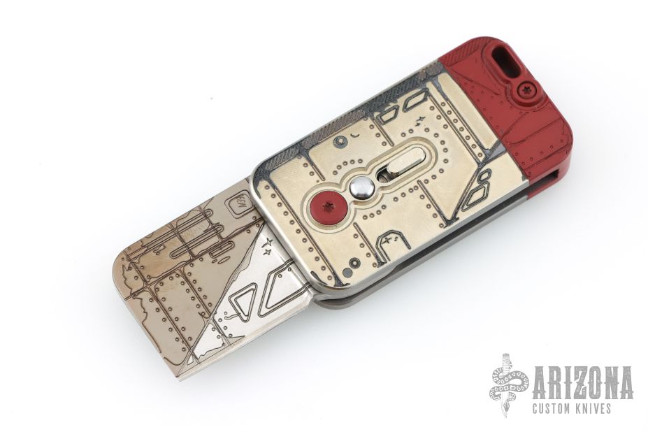 This Squarehead Auto by Darriel Caston features a laser engraved blade. The handle is laser engraved and cerakote finished titanium, has safety and lanyard bail. Does not lock itself open when deployed. Otherwise, the knife is in excellent condition.