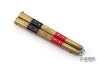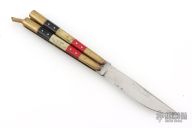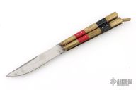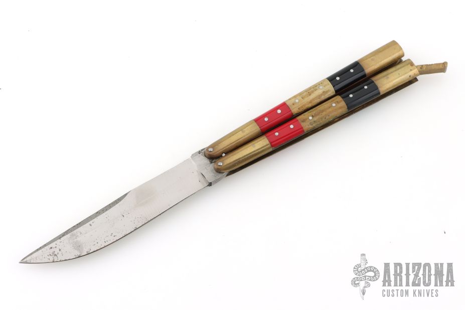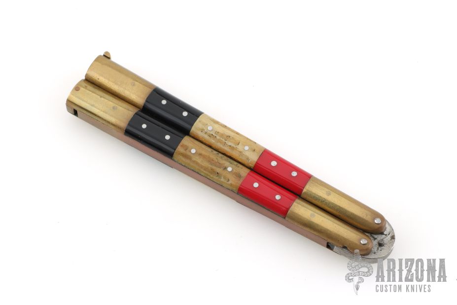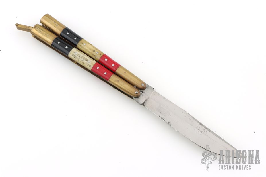 This balisong from the Philippines features a satin finished blade with false top edge. The handle has brass bolsters and channel/liners, red/black/bone scales with aluminum pins, brass T-latch. Has some scratches and patina, otherwise good condition.