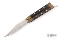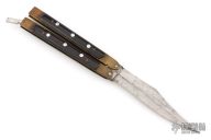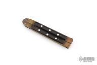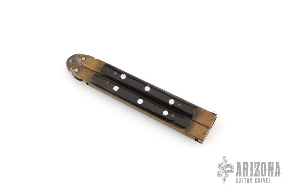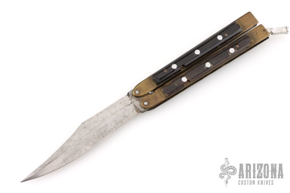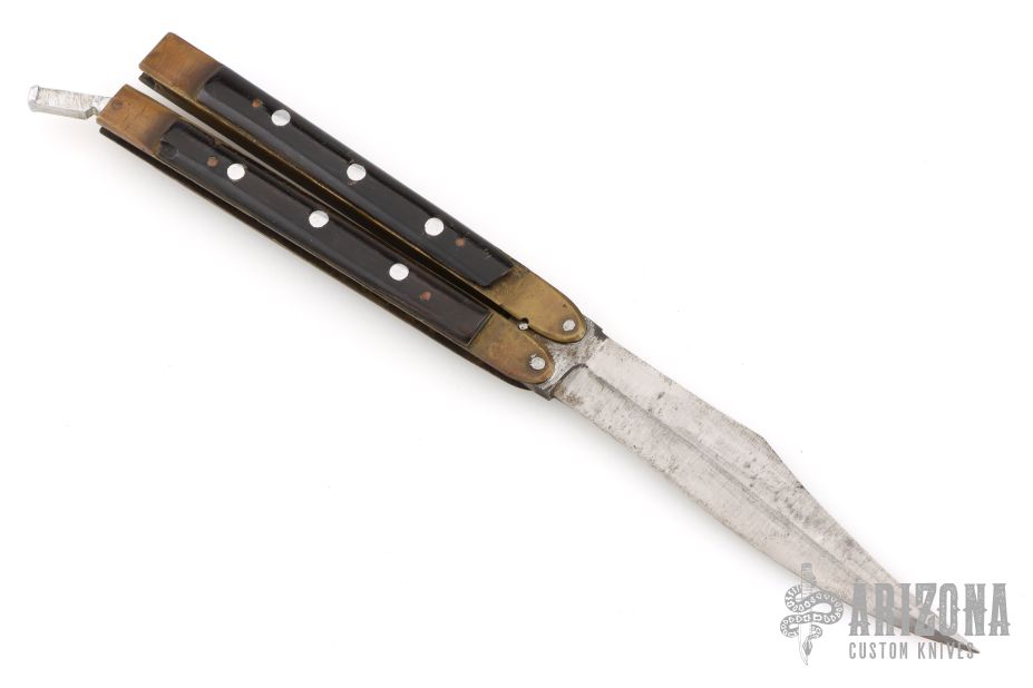 This balisong from the Philippines features a satin finished blade. The handle has brass channel/liners, black acrylic scales with aluminum pins, aluminum T-latch. Has some scratches and oxidation, has blade play, has some cracks/chips in scales, poor condition.