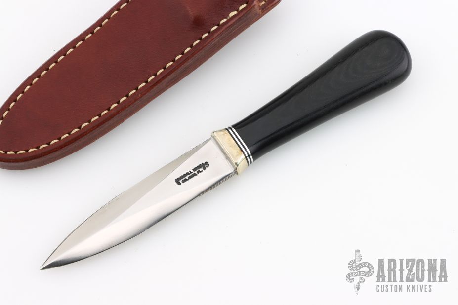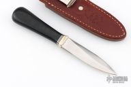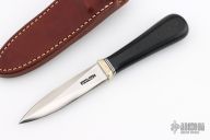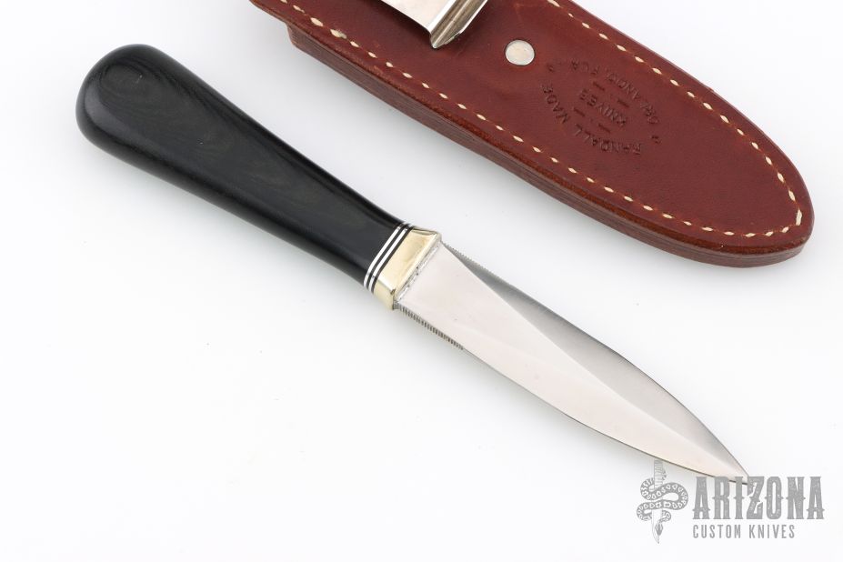 This Model 24 Guardian by Randall Made Knives features a satin finished double-edged blade with notched finger rests, .179" blade stock and .832" blade depth, hidden tang construction. Black linen micarta grip with black/duralumin spacers and a nickel silver guard. Both edges of the blade are sharpened with 1" of thumb notches. This model was designed in 1978 for use by police, undercover agents and law enforcement personnel for self-protection and as a back-up weapon. Comes with a brown leather sheath w/ boot clip. Comes with a Randall zippered case. Excellent condition.