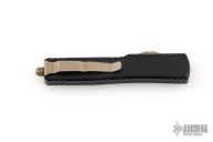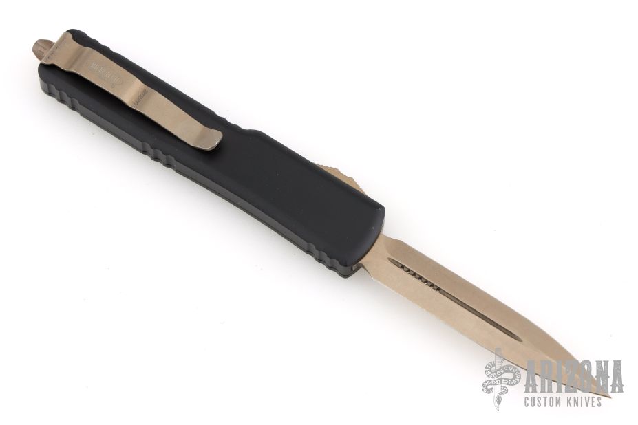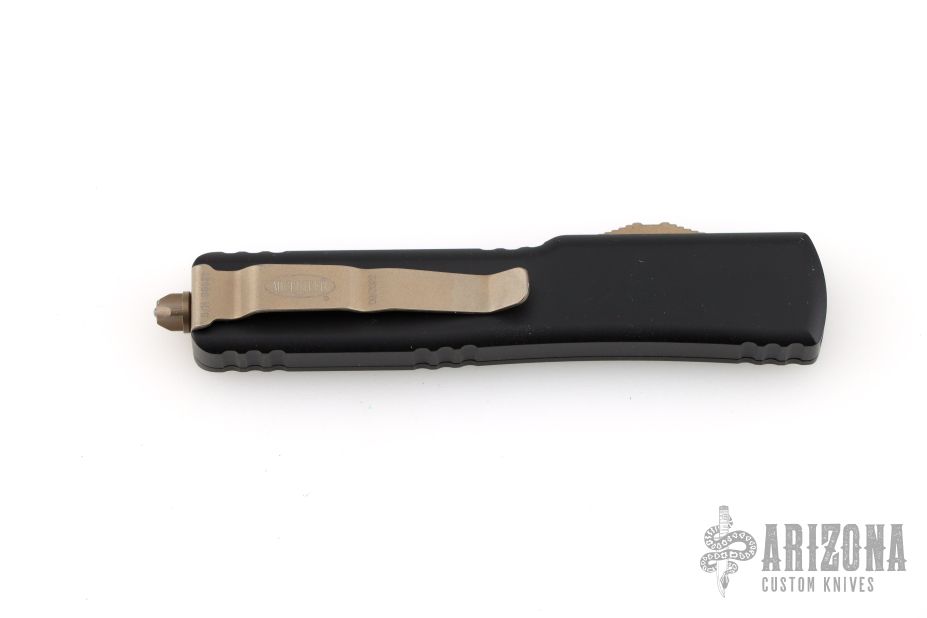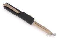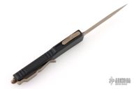 This UTX-70 OTF automatic by Microtech features a bronze stonewash finished double edged blade with fullers. The handle has a black aluminum frame with bronze stainless steel tip down clip and hardware. Serial number 38591 and dated 09/2022. Comes with original box and papers. Excellent condition.