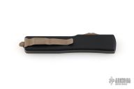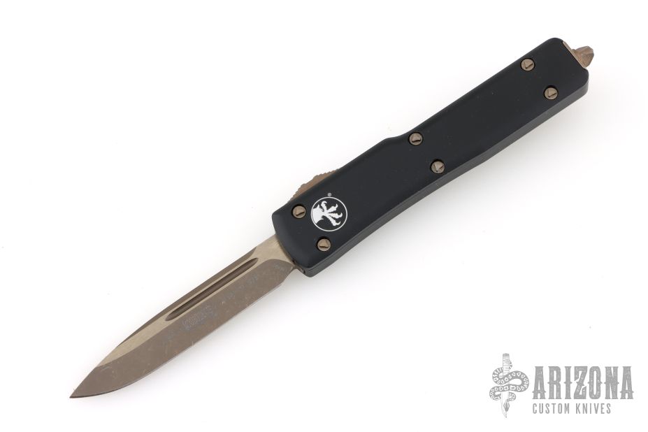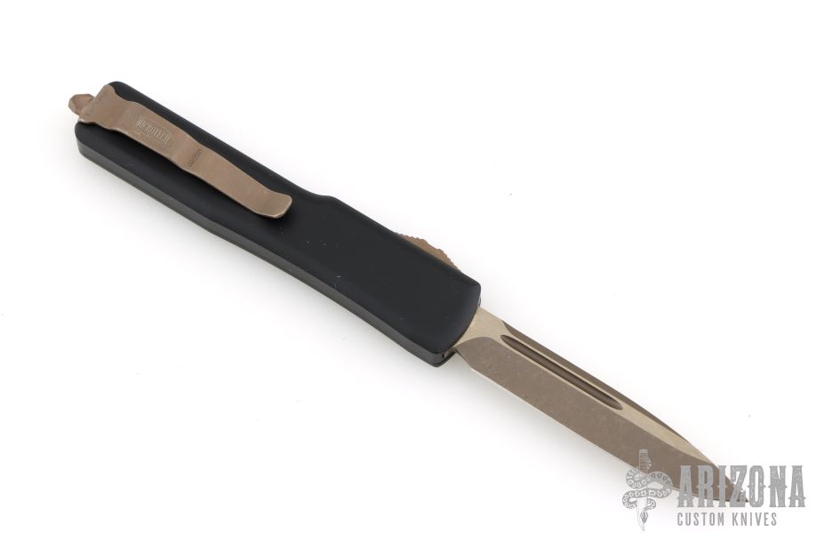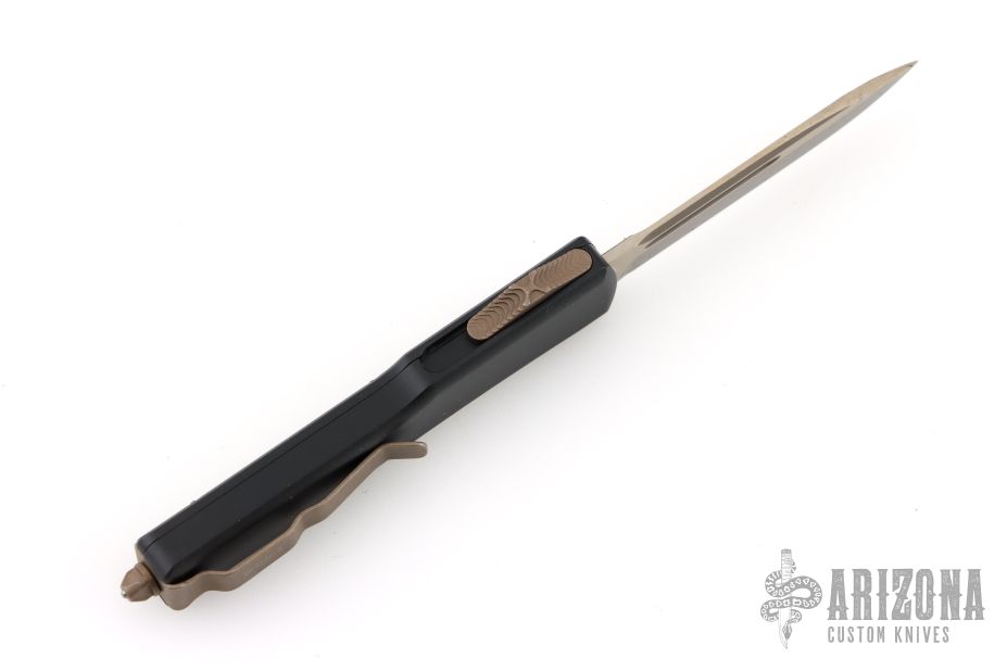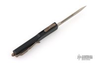 This UTX-70 features a bronze apocalyptic drop point blade. The handle has a black anodized aluminum handle with bronze apocalyptic stainless steel hardware, thumb slide and tip down pocket clip. 09/2021 and S/N 26731. Comes with original box and papers. Excellent condition.