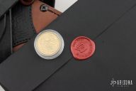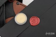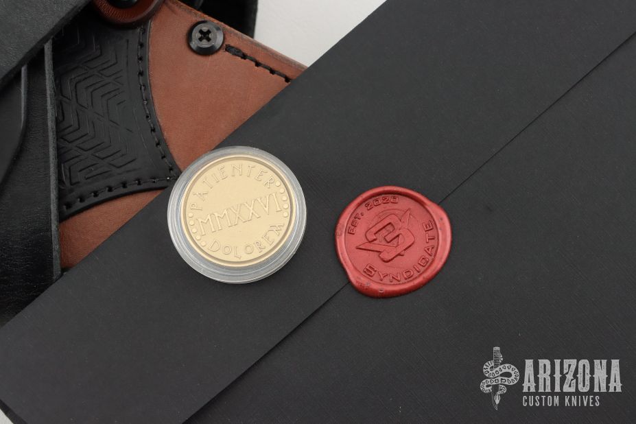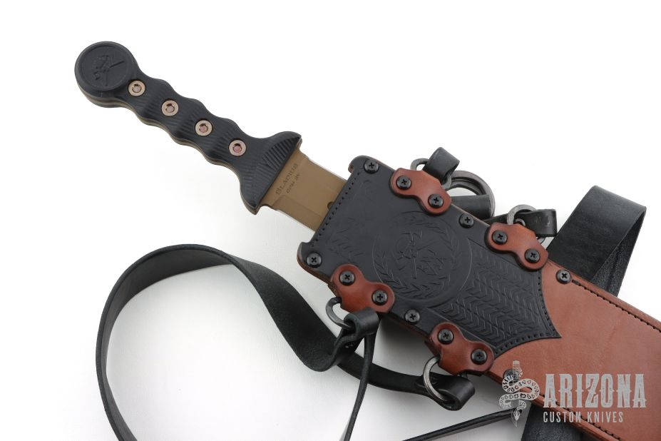 The Gladius comes with a leather sheath, designed to protect the blade and ensure safe carrying. The sheath is part of a custom packaging that includes a crate requiring a Phillips screwdriver to open, adding to the overall premium feel of the product.