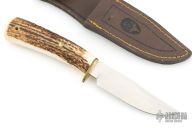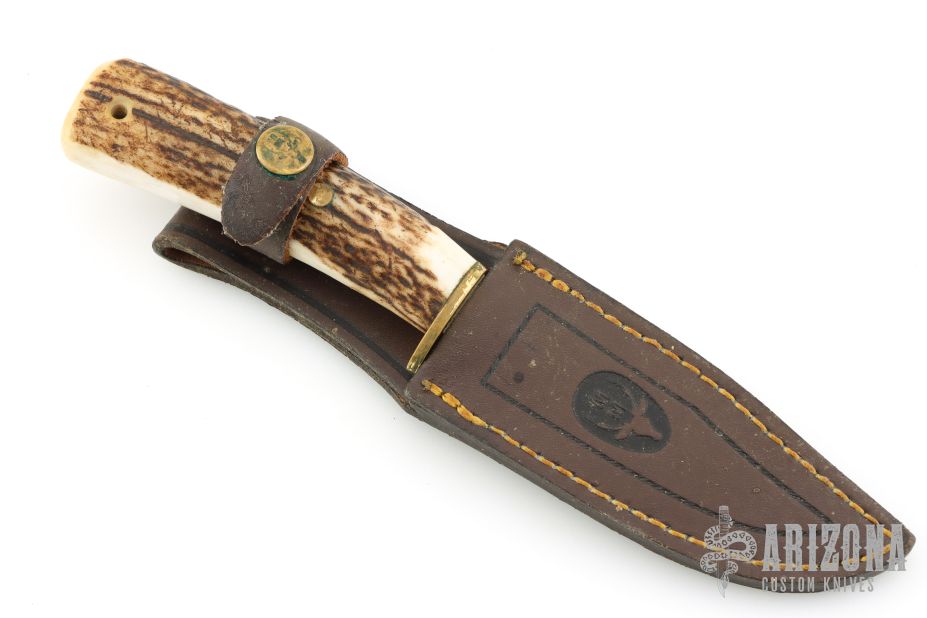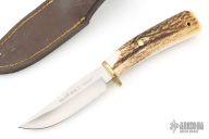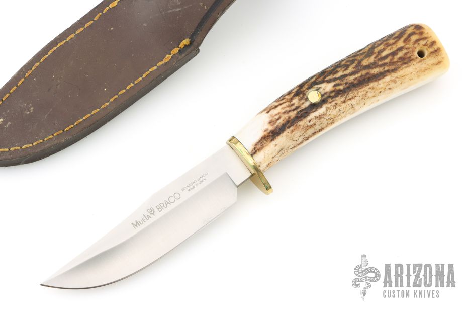 This Braco by Muela features a satin finished blade with hidden tang construction, .144" blade stock and .99" blade depth. The handle has a brass guard and stag grip. Lanyard hole in pommel. Comes with leather sheath. Has a couple light scratches/patina, otherwise great condition.