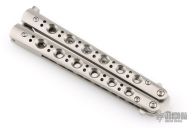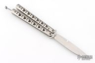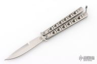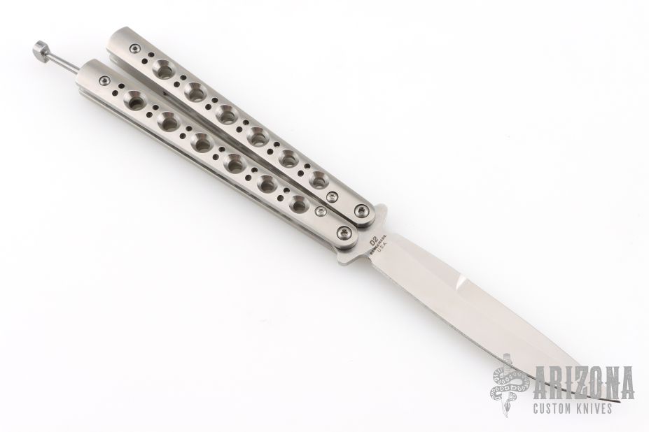 This Model 62 Balisong by Benchmade features a stonewashed spear point D2 blade with a false top edge. The handle has stainless steel handles and latch. Includes the original box, papers and nylon sheath. Excellent condition.