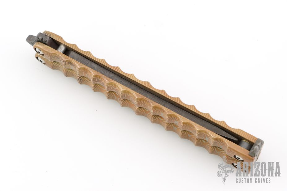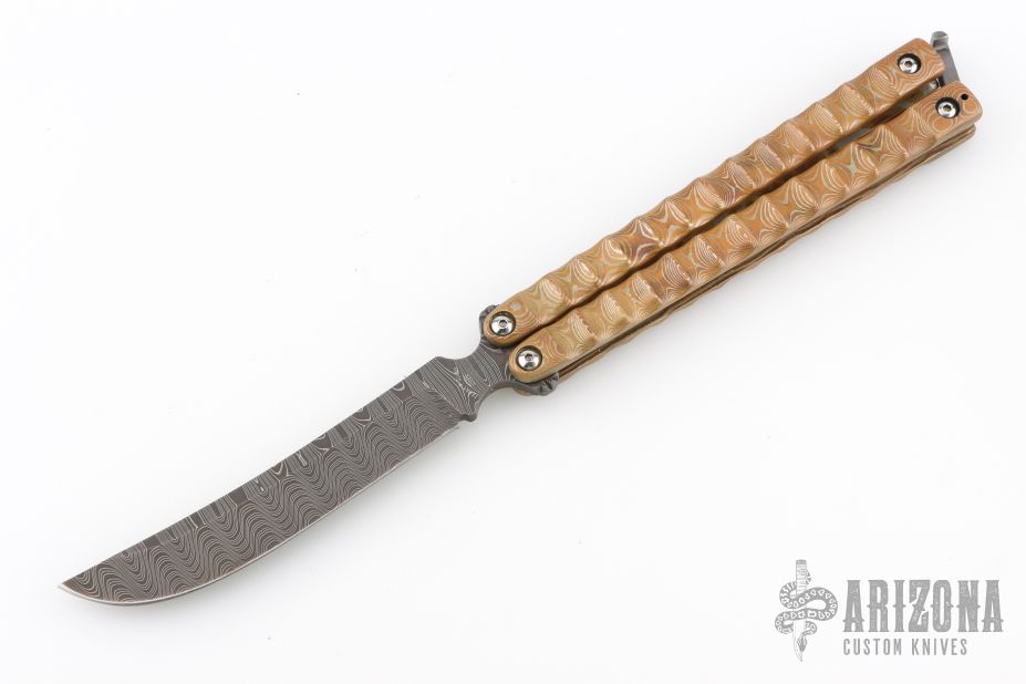 This Balisong by Terry Guinn features an upswept Damascus blade with fileworked tang. The handle has carved mokume handles with Damascus spacers and fileworked T-latch. Nice tight lockup and both positions. Dated 2006 and s/n 030. Excellent condition.