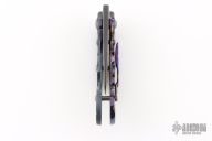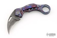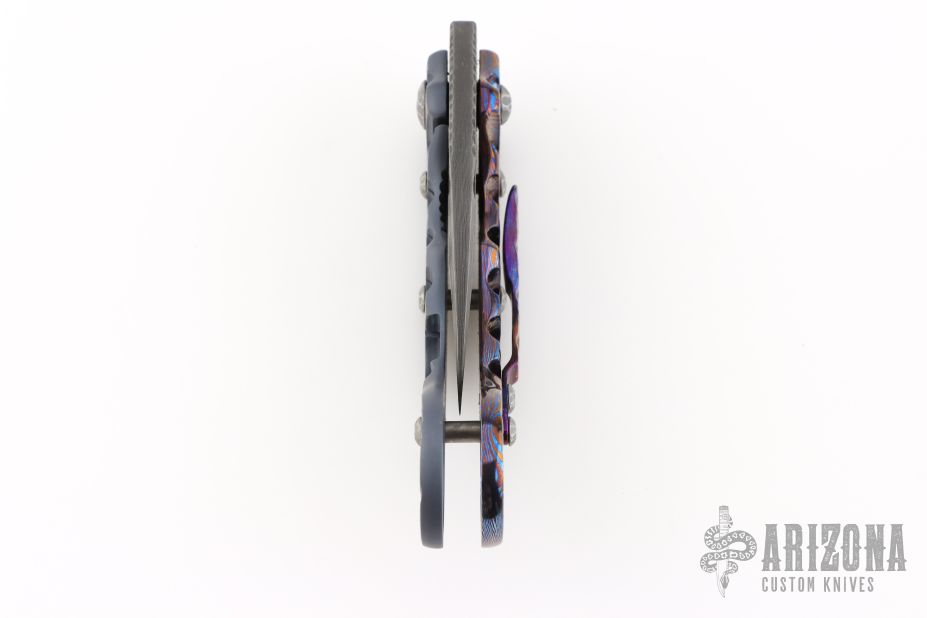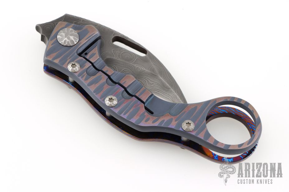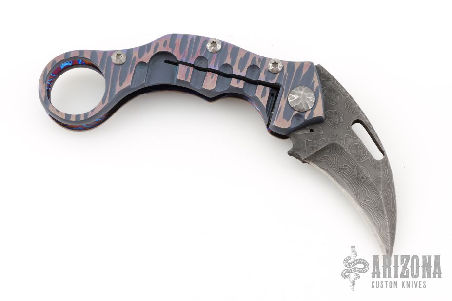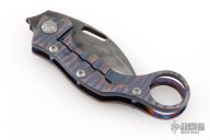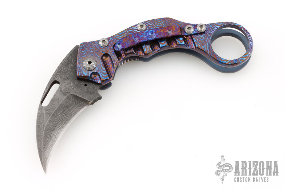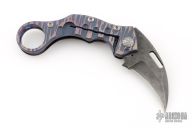 This Framelock Karambit from James Coogler features a Damascus blade with notched spine and thumb hole. The handle features a textured timascus frame with matching tip-up clip, carved hardware, carved titanium lock. Nice detent and blade seating. This unique custom piece from Mr. Coogler is in excellent condition. Comes with original hard shell case.
