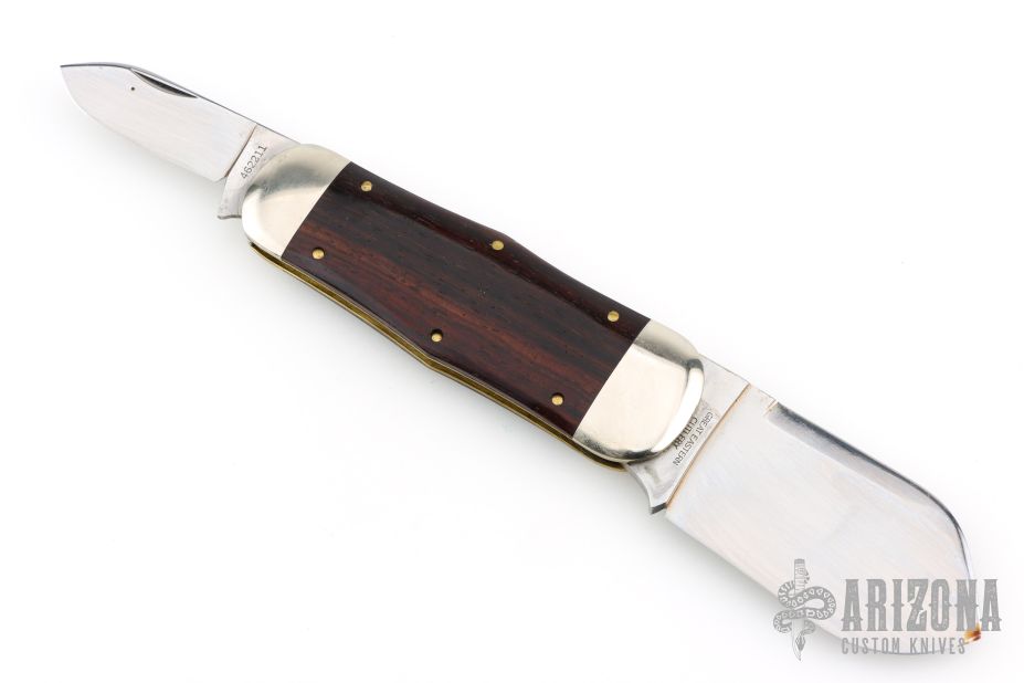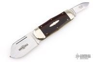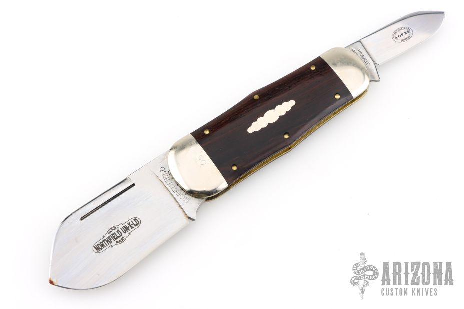 The Northfield Whaler knife has satin polish finish blades with nail nicks. The handle has nickel silver bolsters, wood covers, nickel silver escutcheon, brass liners and steel spring. Comes with original tube, COA, and wax paper. Has some light scuffs, otherwise excellent condition. #05/25 07/27/2011