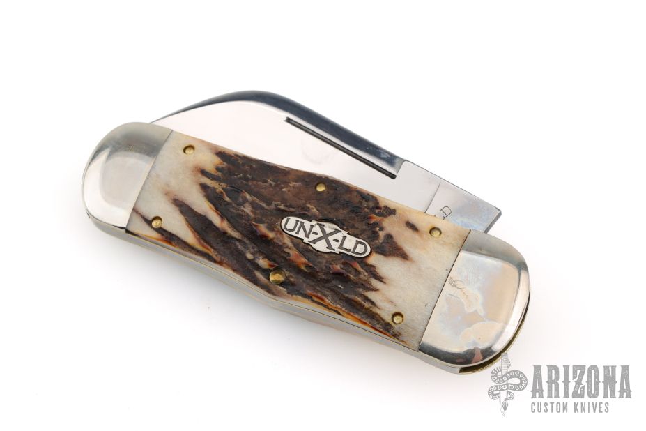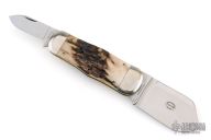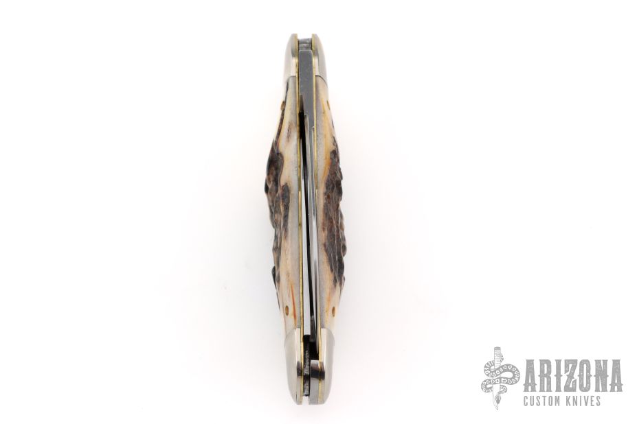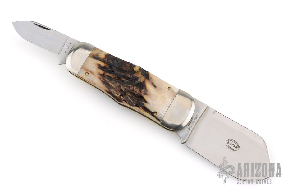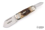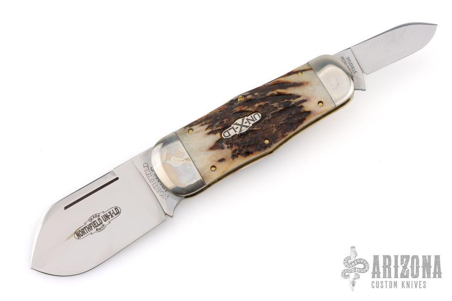The Northfield Whaler knife has satin polish finish blades with nail nicks. The handle has nickel silver bolsters, stag covers, nickel silver escutcheon, brass liners and steel spring. Comes with original tube, COA, and wax paper. Has some light scuffs, otherwise excellent condition. #04/25 08/04/2011