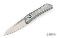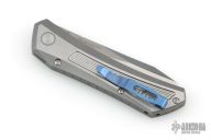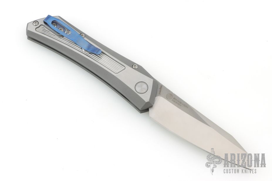 This Custom Oligarch by Pro-Tech Knives features a satin finished wharncliffe shaped blade. The handle has a two-tone 17-4 stainless frame with abalone inlay in push button, blue titanium deep carry tip up clip. Comes with original box and papers. Excellent condition!
