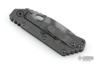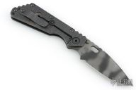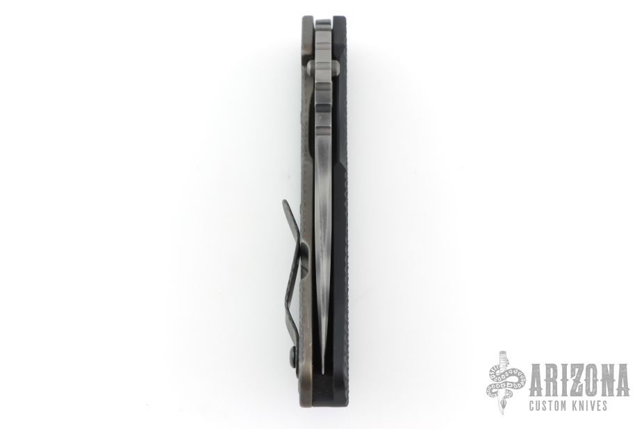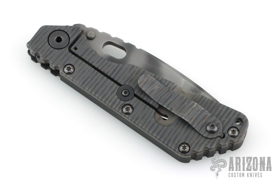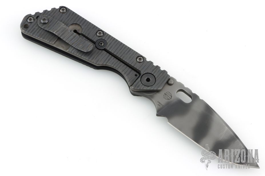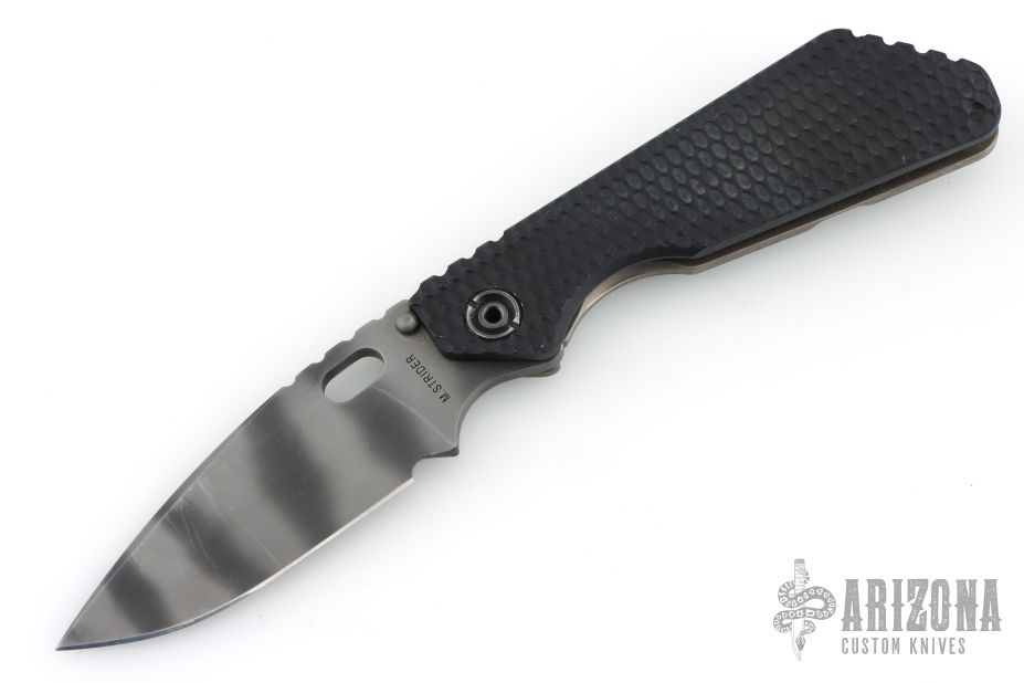 This SMF framelock folder by Mick Strider features a tiger striped drop point blade and a dimple pattern black aluminum and flamed titanium frame and tip up titanium clip. Includes a "Lock Bar Stabilizer" for maximum reverse lock retention. Nice detent, lockup and blade seating. Has some scuffs and scratches, otherwise good condition.