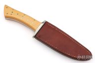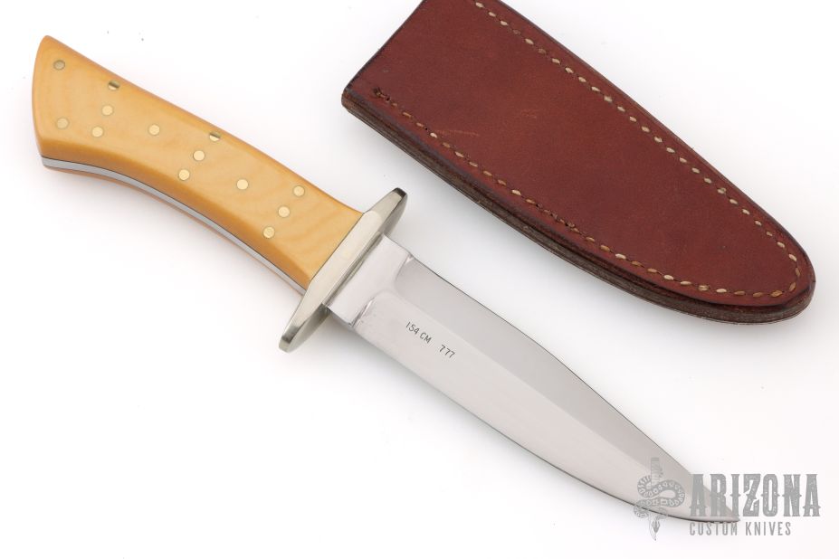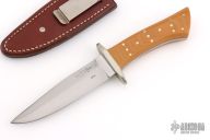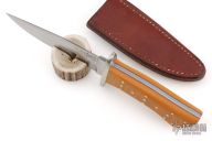 This Fighter by TM Enos features a double edged hand rub satin finished blade with .199" blade stock and 1.128" blade depth, full tang construction. The handle has a nickel silver guard, yellow paper micarta scales with brass pins and black liners. Comes with a leather boot sheath with clip. Dated 1978 and #777. Has a couple light scratches, excellent condition otherwise. This is one of the first knives he made with 154CM steel.