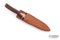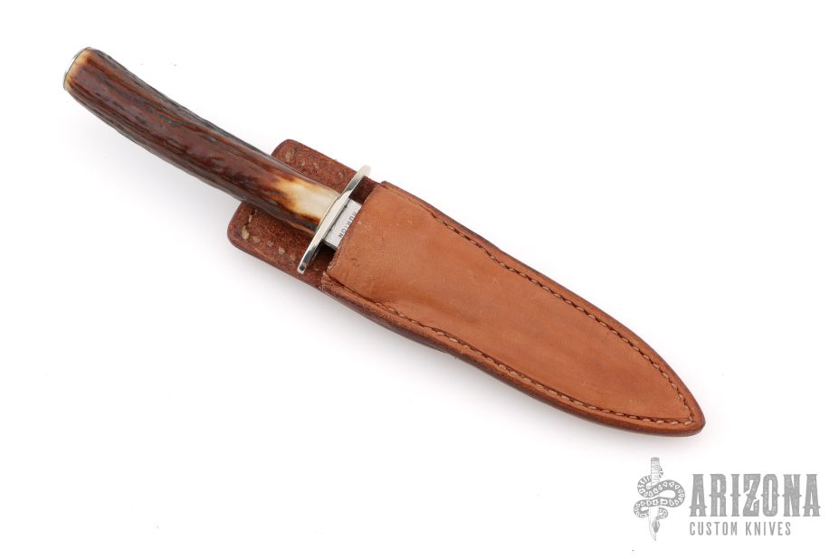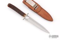 This Dagger by Dennis Burton features a satin polished double edged blade with .180" blade stock and .795" blade depth, hidden tang construction. The handle has a nickel silver guard and butt with a stag grip. Comes with a brown leather sheath with boot clip. Excellent condition. The consignor said he purchased this from the maker's table at the 1979 Birmingham, Alabama knife show.