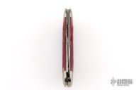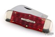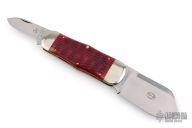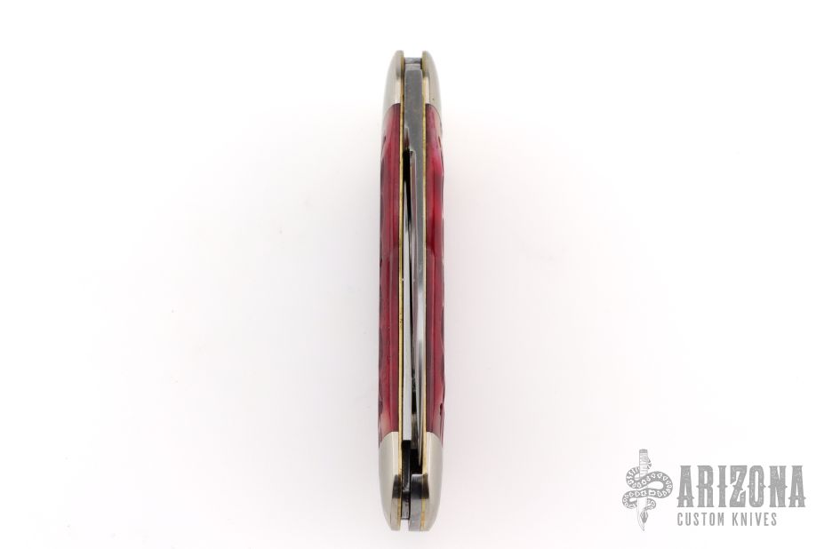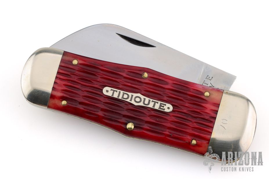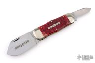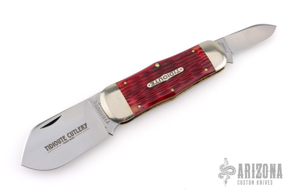 The Tidioute Whaler knife has satin polish finish blades with nail nicks. The handle has nickel silver bolsters, red bone covers, nickel silver escutcheon, brass liners and steel spring. Comes with original tube, COA dated 7/30/2011 and wax paper. Has some light scuffs and scratches, otherwise great condition.