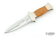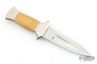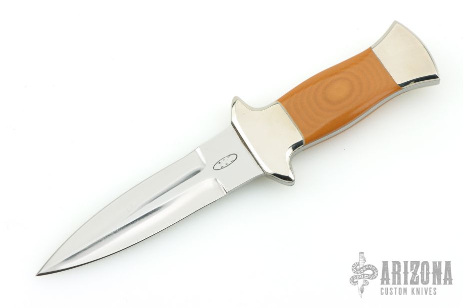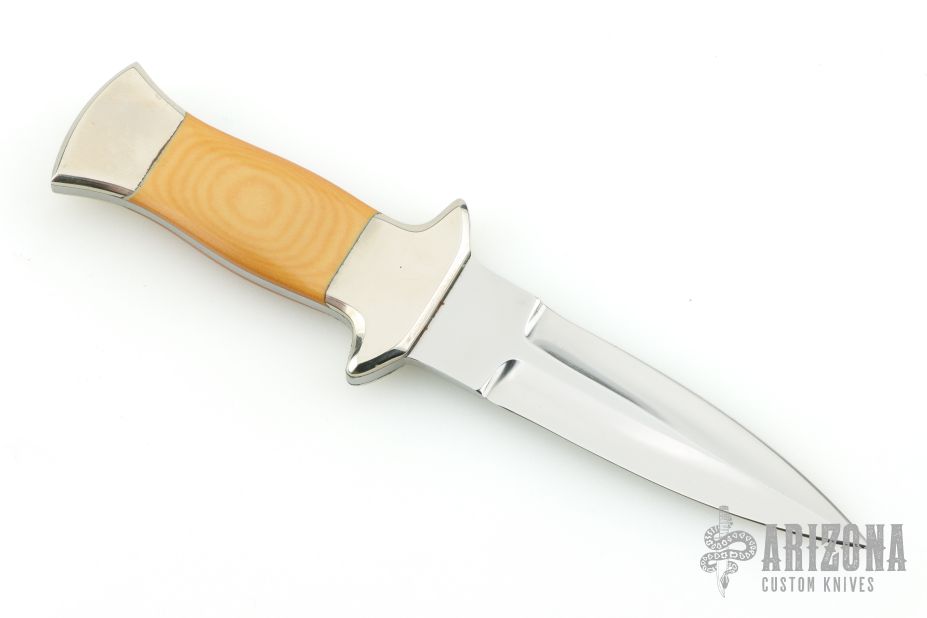 This Dagger by RD Nolen features a mirror finished double edged blade with .117" blade stock and .826" blade depth, full tang construction. The handle has dovetailed nickel silver bolsters, yellow paper micarta scales. Excellent condition.