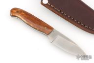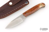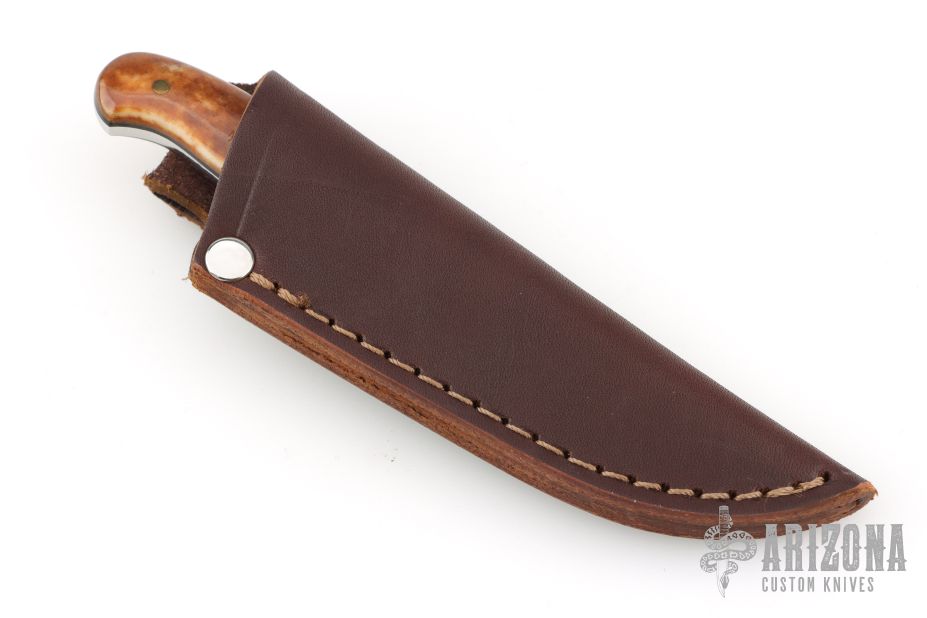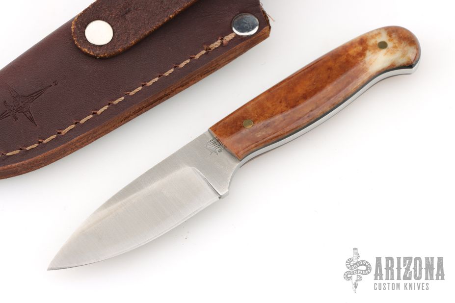 This knife by LT Wright features a satin finished saber ground blade with .121" blade stock and .865" blade depth, full tang construction. The handle has brown dyed bone scales with black liners and brass pins. Comes with a brown leather sheath and original box. Excellent condition.