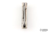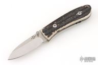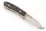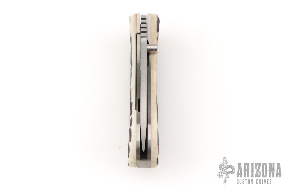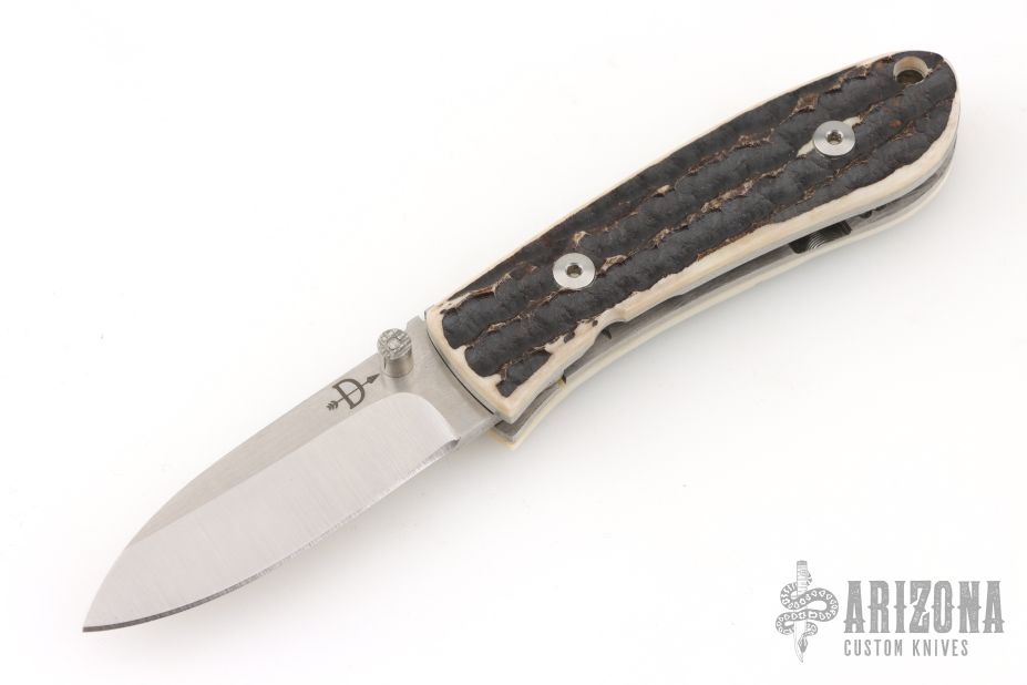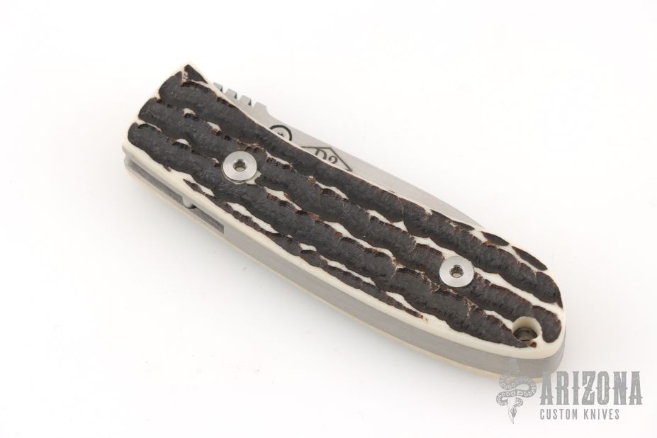 This DK-FHS linerlock folder by Dozier Knives has a satin finished D2 stainless steel drop point D2 blade with notched thumbrest and single thumbstud. The handle has jigged bone scales, titanium liners and a titanium backspacer. Has a couple light scratches, otherwise excellent condition.
