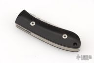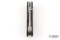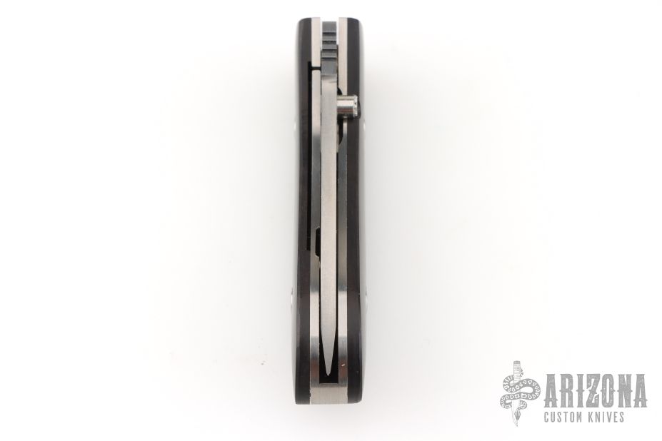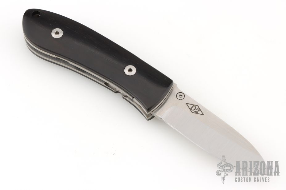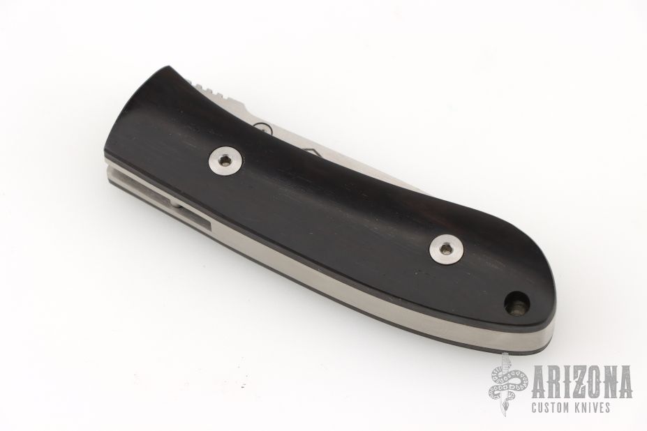 This DK-FHS linerlock folder by Dozier Knives has a satin finished D2 stainless steel drop point D2 blade with notched thumbrest and single thumbstud. The handle has bog oak scales, titanium liners and a titanium backspacer. Excellent condition.
