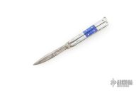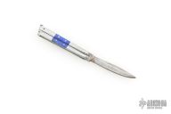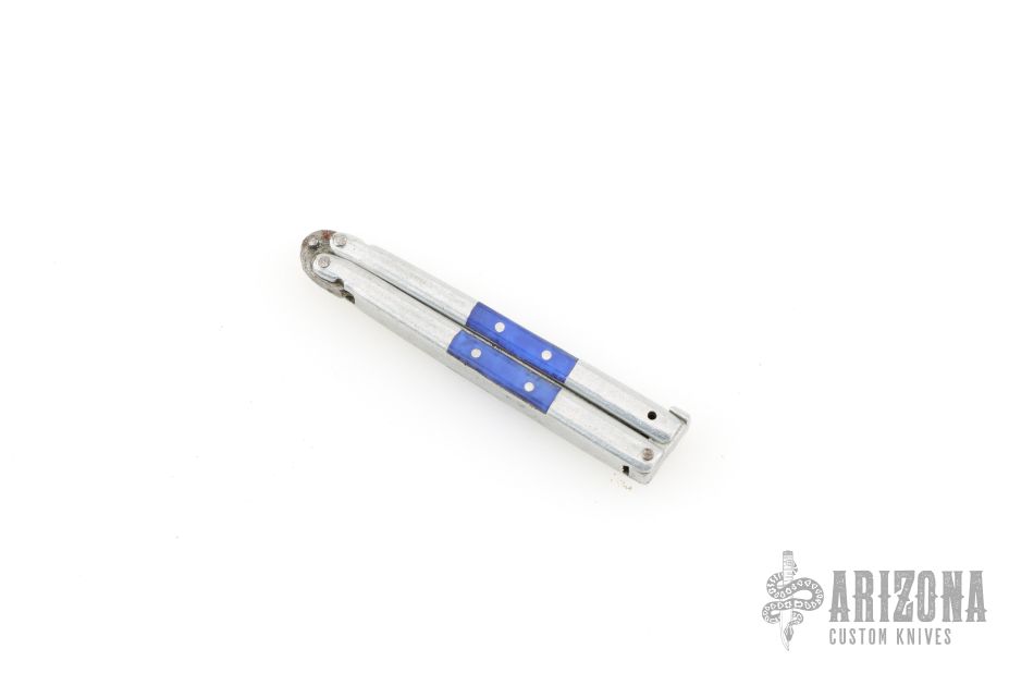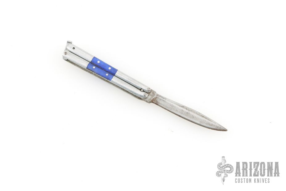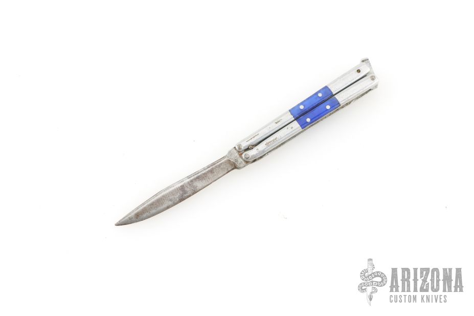 This Mini Balisong from the Philippines features a stainless steel drop point blade. The handle has aluminum channel construction with blue inlays and an aluminum latch. Excellent Conditon.