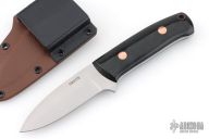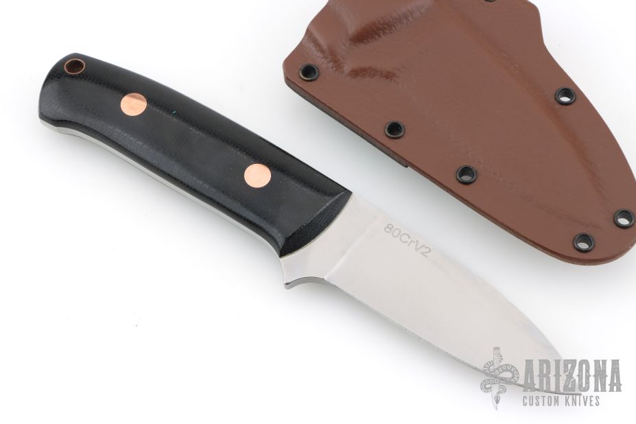 This knife from Dan Crotts features a satin finish drop point blade with .156" blade stock and 1.091" blade depth, full tang construction. The handle has black canvas micarta scales with brass pins and lanyard tube. Includes kydex sheath with belt loop set up for horizontal carry. Excellent condition.