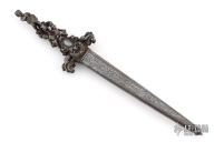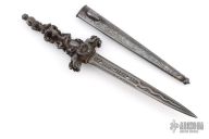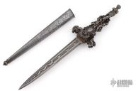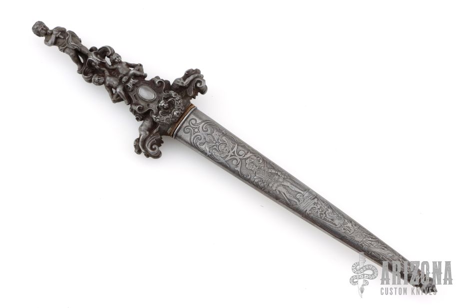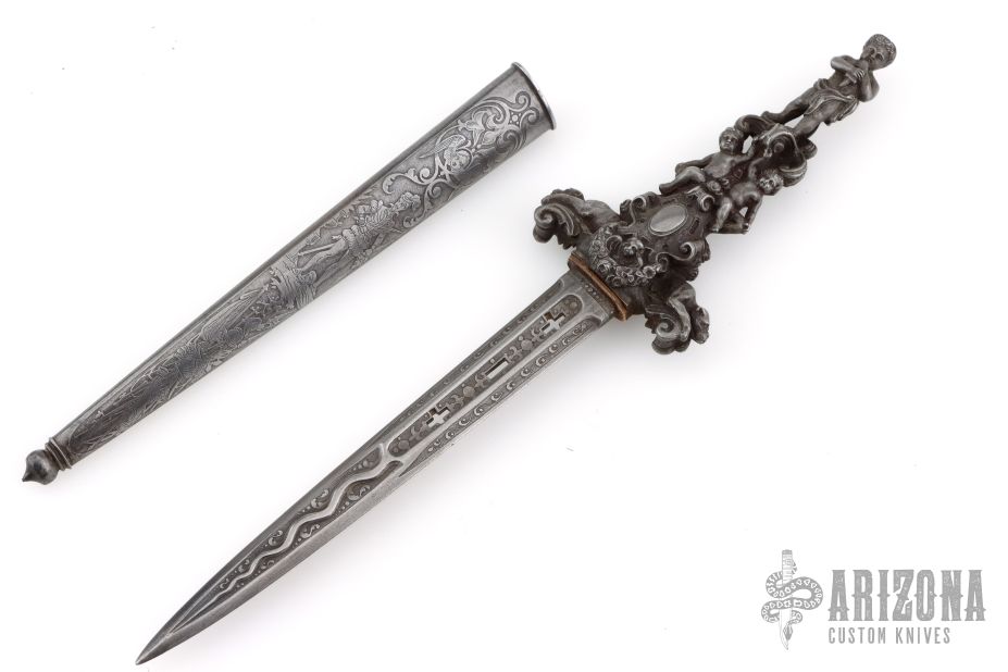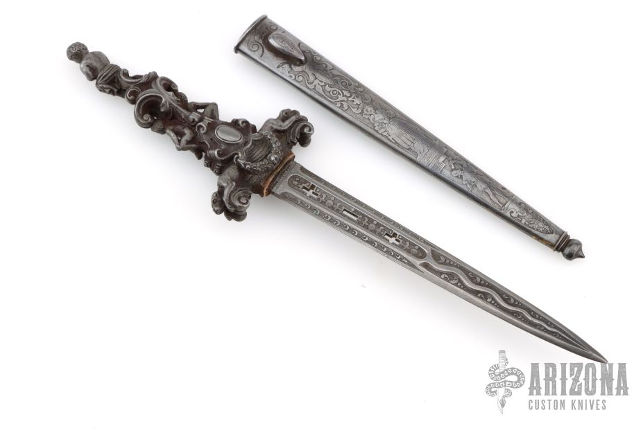 This Romantic Dagger is from the 1800s approximately. It has a dagger blade with fullers and nicely detailed etchings, edges are not sharp, but they are not intended to be. The handle is cast/carved steel with amazing detail. The scabbard is steel and has detailed etchings. Has some light patina, otherwise excellent condition for its age.