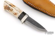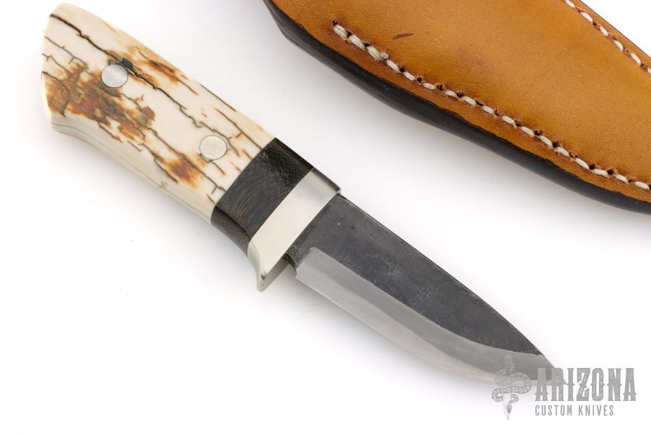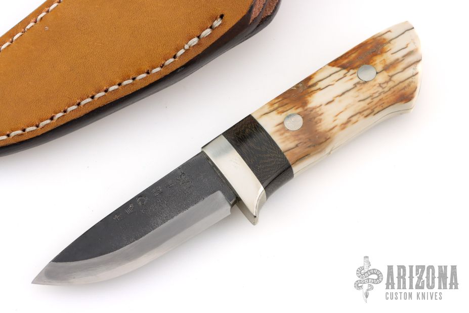 This sheath knife by Shosui Takeda features a Stainless Clad Aogami Super Steel (NAS) blade, .136" blade stock and .892" blade depth, hidden tang construction. The handle has nickel silver guard, and a 2-piece mammoth ivory grip with nickel silver pins and a black linen micarta spacer. Comes with a brown leather sheath. Handle by Moriya. Excellent condition.