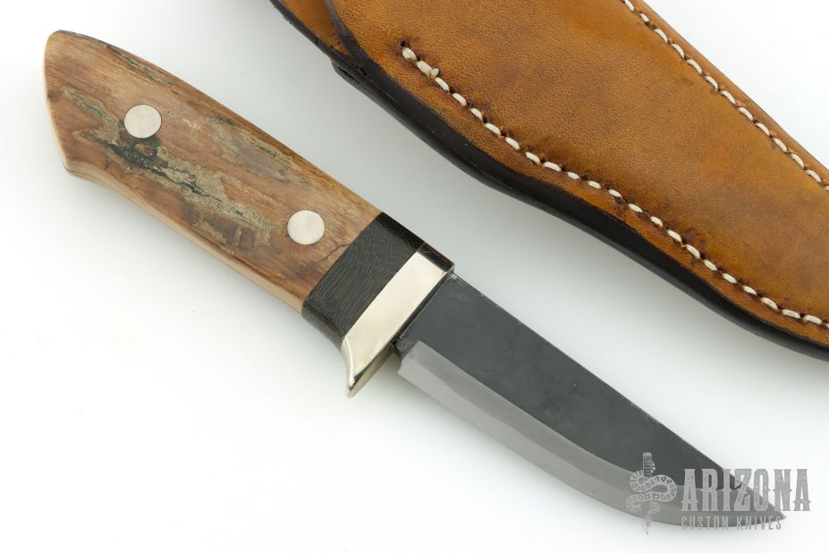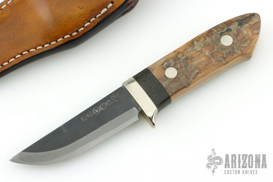 This sheath knife by Shosui Takeda features a Stainless Clad Aogami Super Steel (NAS) blade, .128" blade stock and .995" blade depth, hidden tang construction. The handle has nickel silver guard, and a 2-piece mammoth ivory grip with nickel silver pins and a black linen micarta spacer. Comes with a brown leather sheath. Handle by Moriya. Excellent condition.