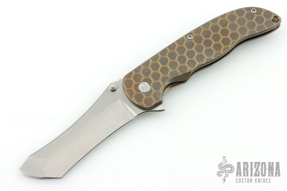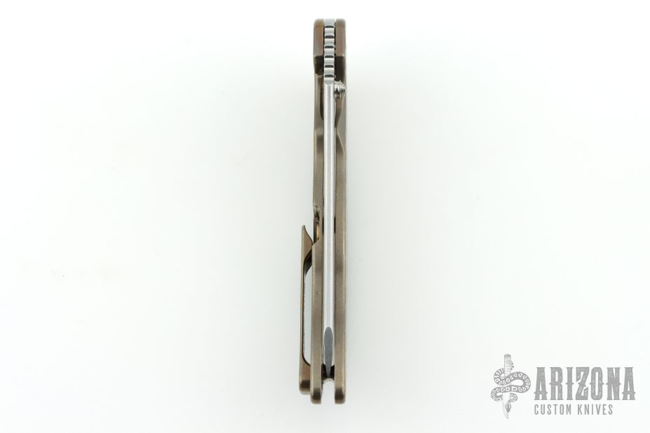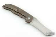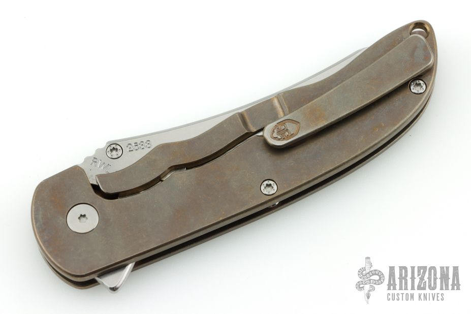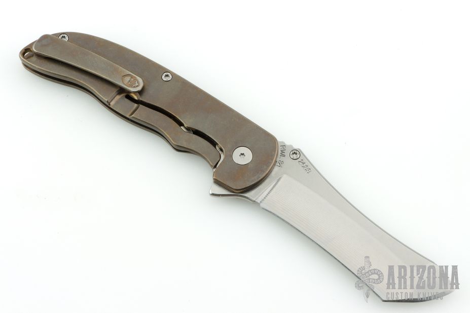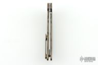 This Norseman (#2633) by John Grimsmo features a tumbled blade with a single titanium thumbstud, notched thumb ramp and flipper. Stonewashed and anodized titanium frame with a reverse honeycomb pattern front scale and titanium screws. Matching tip up pocket clip. Very smooth action that requires no wrist movement. Nice detent, lockup and blade seating. Rides on ceramic bearings. Comes with original box and COA dated August 9, 2019. Excellent condition.