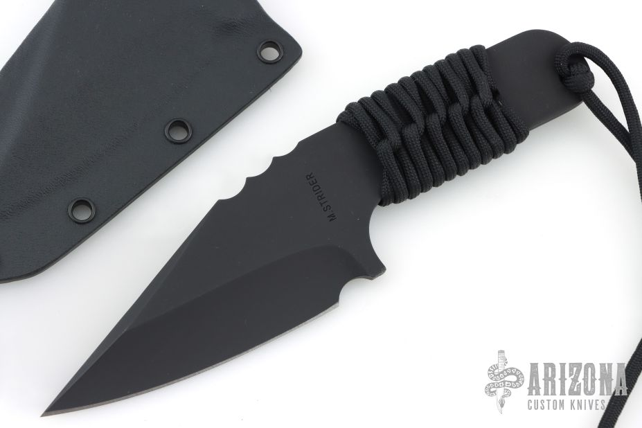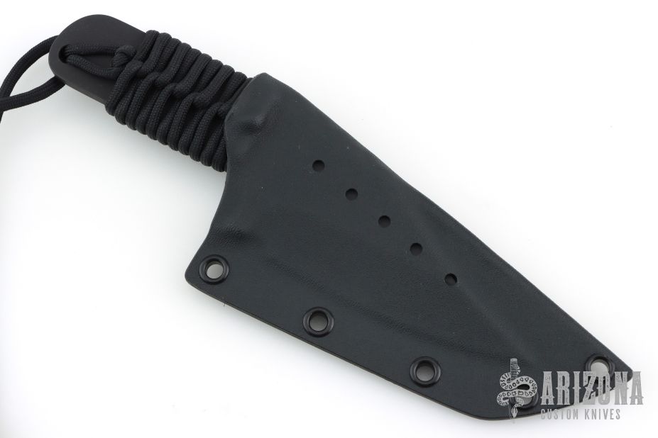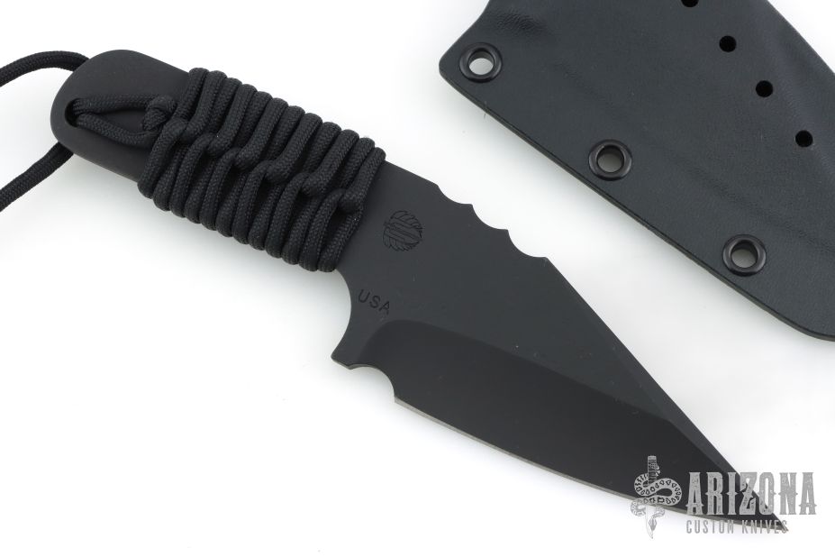 The V-Junior by Mick Strider features a black blade with false top edge, .221" blade stock and 1.816" blade depth, full tang construction with black cord wrapped handle. Comes with kydex sheath. Excellent condition.
