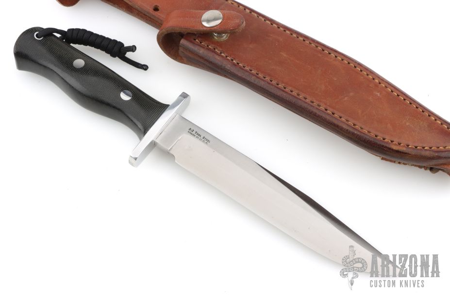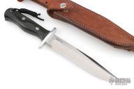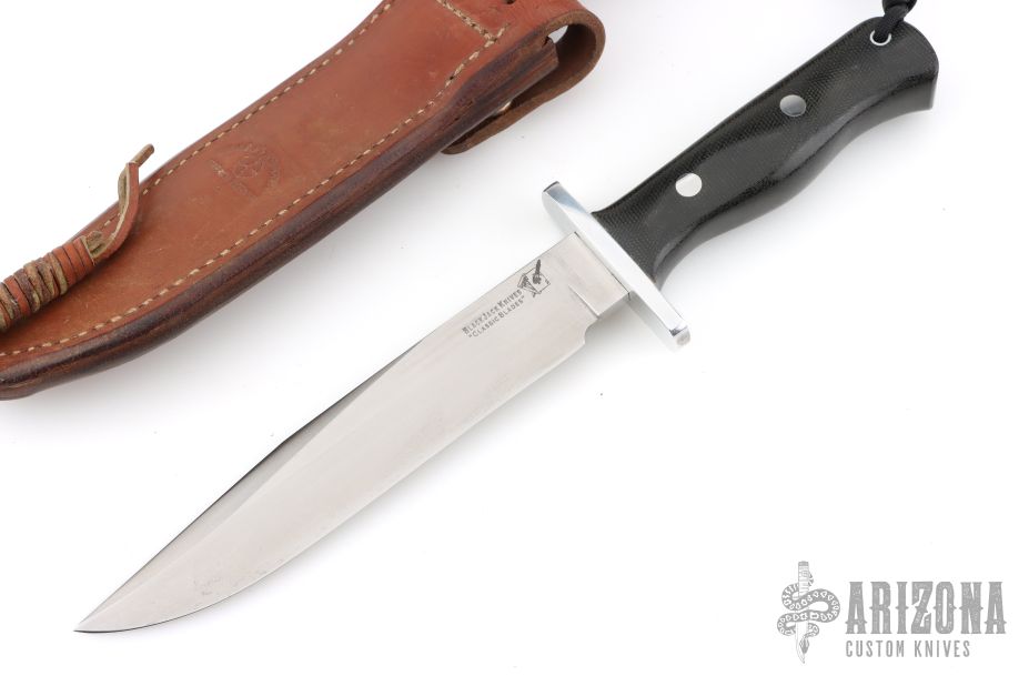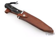 This Model 14 Halo Attack by Blackjack Knives features a satin finished clip point blade with false top edge, .236" blade stock and 1.255" blade depth, full tang construction. The handle has a polished aluminum guard, black canvas micarta grip. Comes with original brown leather sheath. Has some light scratches, otherwise excellent condition.