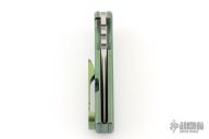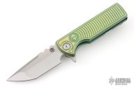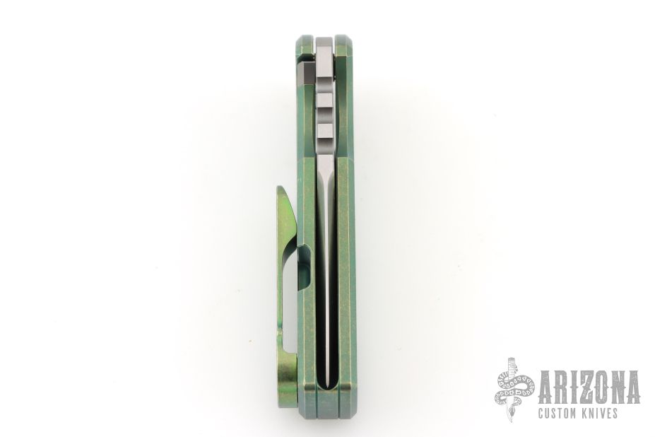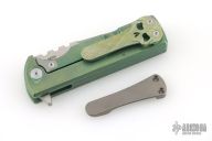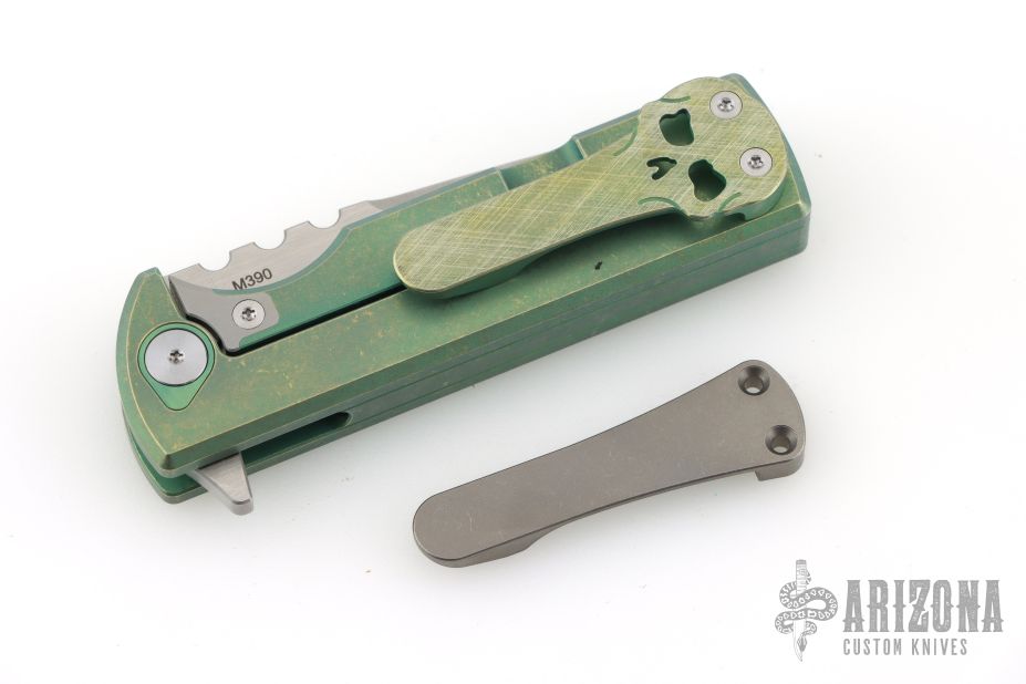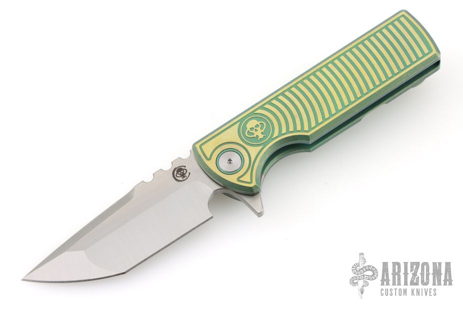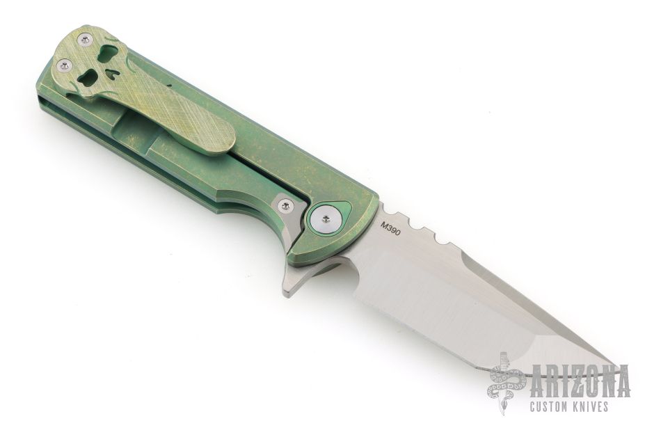 This Chaves T.A.K. features a satin finished tanto blade with the Chaves logo and a notched thumbrest. The handle has an anodized/milled/stonewashed titanium frame and a matching reversible skull pocket clip. Comes with original box and extra clip. Excellent condition.